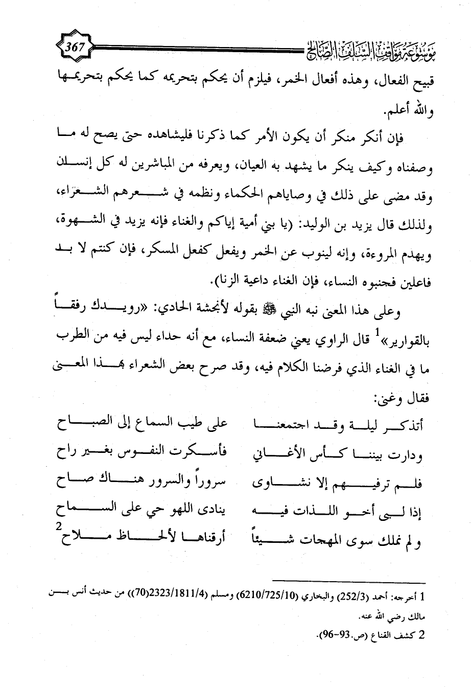 فإن أنكر منكر أن يكون الأمر كما ذكرنا فليشاهده حتى يصح له ما وصفناه وكيف ينكر ما يشهد به العيان، ويعرفه من المباشرين له كل إنسان وقد مضى على ذلك في وصاياهم الحكماء ونظمه في شعرهم الشعراء، ولذلك قال يزيد بن الوليد: (يا بني أمية إياكم والغناء فإنه يزيد في الشهوة، ويهدم المروءة، وإنه لينوب عن الخمر ويفعل كفعل المسكر، فإن كنتم لا بد فاعلين فجنبوه النساء، فإن الغناء داعية الزنا).