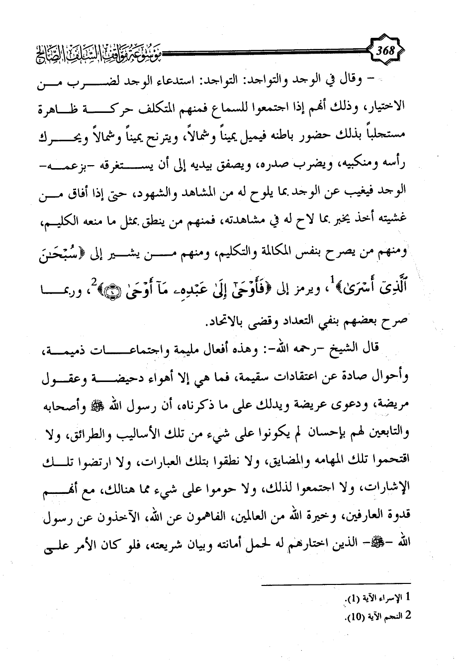 - وقال في الوجد والتواجد: التواجد: استدعاء الوجد لضرب من الاختيار، وذلك أنهم إذا اجتمعوا للسماع فمنهم المتكلف حركة ظاهرة مستجلباً بذلك حضور باطنه فيميل يميناً وشمالاً، ويترنح يميناً وشمالاً ويحرك رأسه ومنكبيه، ويضرب صدره، ويصفق بيديه إلى أن يستغرقه -بزعمه- الوجد فيغيب عن الوجد بما يلوح له من المشاهد والشهود، حتى إذا أفاق من غشيته أخذ يخبر بما لاح له في مشاهدته، فمنهم من ينطق بمثل ما منعه الكليم، ومنهم من يصرح بنفس المكالمة والتكليم، ومنهم من يشير إلى {سُبْحَانَ الَّذِي أَسْرَى} (¬1)، ويرمز إلى {فَأَوْحَى إِلَى عَبْدِهِ مَا أَوْحَى (10)} (¬2)، وربما صرح بعضهم بنفي التعداد وقضى بالاتحاد.