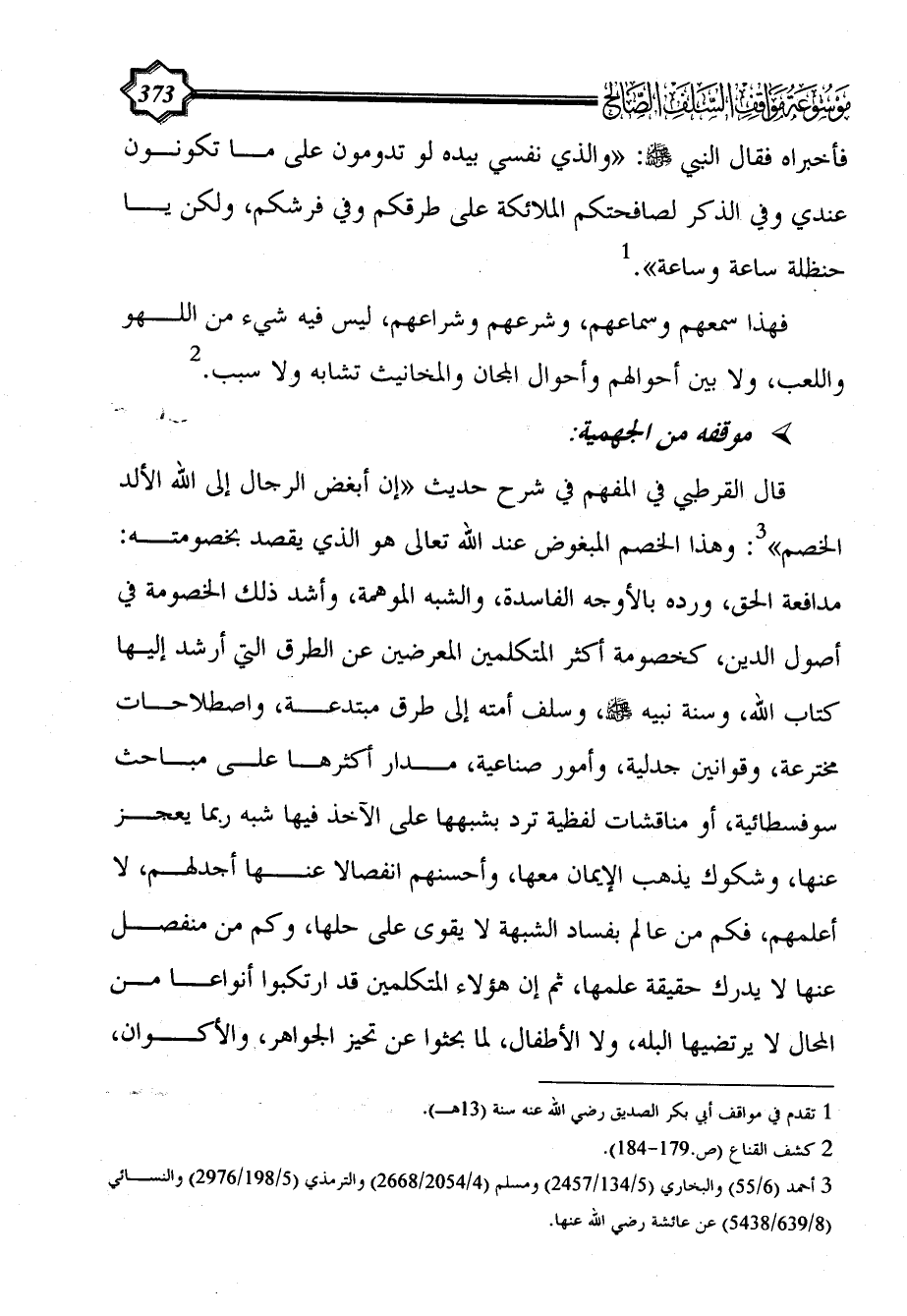 قال القرطبي في المفهم في شرح حديث «إن أبغض الرجال إلى الله الألد الخصم» (¬3): وهذا الخصم المبغوض عند الله تعالى هو الذي يقصد بخصومته: مدافعة الحق، ورده بالأوجه الفاسدة، والشبه الموهمة، وأشد ذلك الخصومة في أصول الدين، كخصومة أكثر المتكلمين المعرضين عن الطرق التي أرشد إليها كتاب الله، وسنة نبيه - صلى الله عليه وسلم -، وسلف أمته إلى طرق مبتدعة، واصطلاحات مخترعة، وقوانين جدلية، وأمور صناعية، مدار أكثرها على مباحث سوفسطائية، أو مناقشات لفظية ترد بشبهها على الآخذ فيها شبه ربما يعجز عنها، وشكوك يذهب الإيمان معها، وأحسنهم انفصالا عنها أجدلهم، لا أعلمهم، فكم من عالم بفساد الشبهة لا يقوى على حلها، وكم من منفصل عنها لا يدرك حقيقة علمها، ثم إن هؤلاء المتكلمين قد ارتكبوا أنواعا من المحال لا يرتضيها البله، ولا الأطفال، لما بحثوا عن تحيز الجواهر، والأكوان،