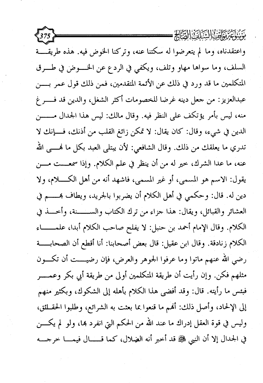 واعتقدناه، وما لم يتعرضوا له سكتنا عنه، وتركنا الخوض فيه. هذه طريقة السلف، وما سواها مهاو وتلف، ويكفي في الردع عن الخوض في طرق المتكلمين ما قد ورد في ذلك عن الأئمة المتقدمين، فمن ذلك قول عمر بن عبد العزيز: من جعل دينه غرضا للخصومات أكثر الشغل، والدين قد فرغ منه، ليس بأمر يؤتكف على النظر فيه. وقال مالك: ليس هذا الجدال من الدين في شيء، وقال: كان يقال: لا تمكن زائغ القلب من أذنك، فإنك لا تدري ما يعلقك من ذلك. وقال الشافعي: لأن يبتلى العبد بكل ما نهى الله عنه، ما عدا الشرك، خير له من أن ينظر في علم الكلام. وإذا سمعت من يقول: الاسم هو المسمى، أو غير المسمى، فاشهد أنه من أهل الكلام، ولا دين له. قال: وحكمي في أهل الكلام أن يضربوا بالجريد، ويطاف بهم في العشائر والقبائل، ويقال: هذا جزاء من ترك الكتاب والسنة، وأخذ في الكلام. وقال الإمام أحمد بن حنبل: لا يفلح صاحب الكلام أبدا، علماء الكلام زنادقة. وقال ابن عقيل: قال بعض أصحابنا: أنا أقطع أن الصحابة رضي الله عنهم ماتوا وما عرفوا الجوهر والعرض، فإن رضيت أن تكون مثلهم فكن. وإن رأيت أن طريقة المتكلمين أولى من طريقة أبي بكر وعمر فبئس ما رأيته. قال: وقد أفضى هذا الكلام بأهله إلى الشكوك، وبكثير منهم إلى الإلحاد، وأصل ذلك: أنهم ما قنعوا بما بعثت به الشرائع، وطلبوا الحقائق، وليس في قوة العقل إدراك ما عند الله من الحكم التي انفرد بها، ولو لم يكن في الجدال إلا أن النبي - صلى الله عليه وسلم - قد أخبر أنه الضلال، كما قال فيما خرجه