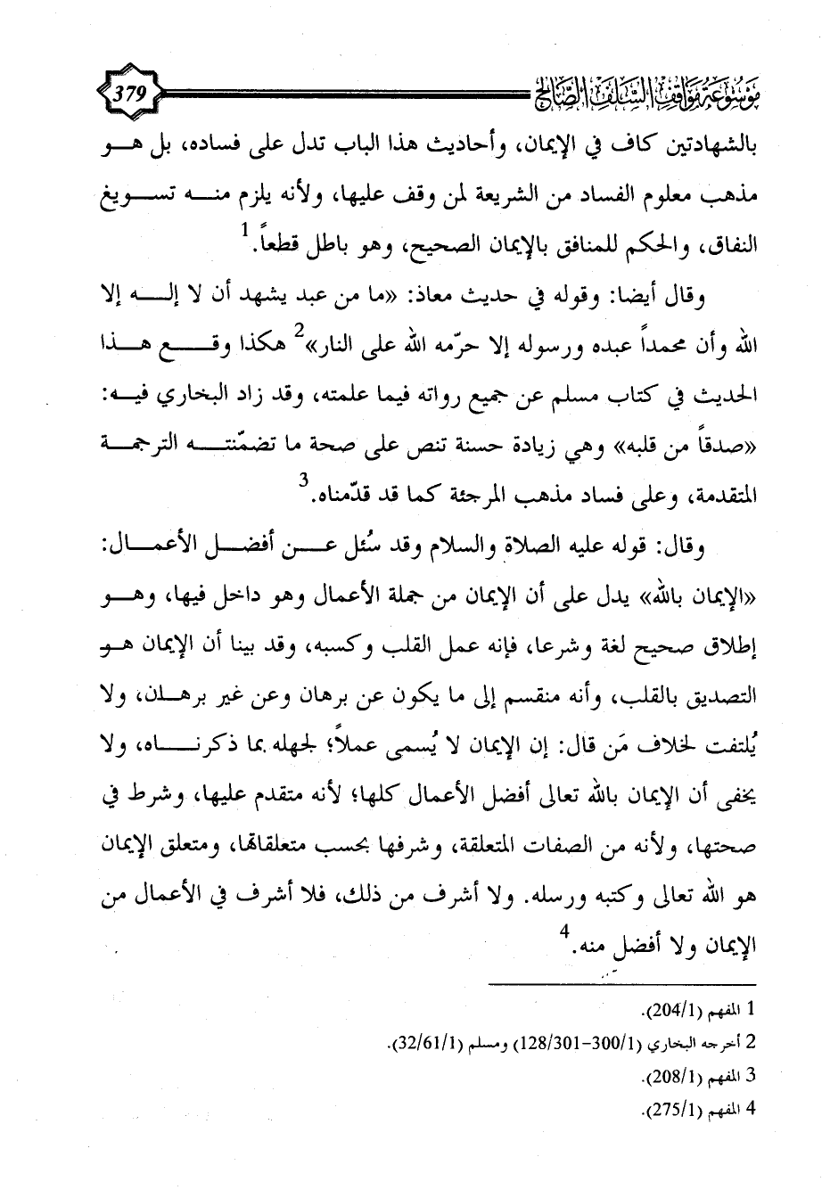 وقال أيضا: وقوله في حديث معاذ: «ما من عبد يشهد أن لا إله إلا الله وأن محمداً عبده ورسوله إلا حرّمه الله على النار» (¬2) هكذا وقع هذا الحديث في كتاب مسلم عن جميع رواته فيما علمته، وقد زاد البخاري فيه: «صدقاً من قلبه» وهي زيادة حسنة تنص على صحة ما تضمّنته الترجمة المتقدمة، وعلى فساد مذهب المرجئة كما قد قدّمناه. (¬3)