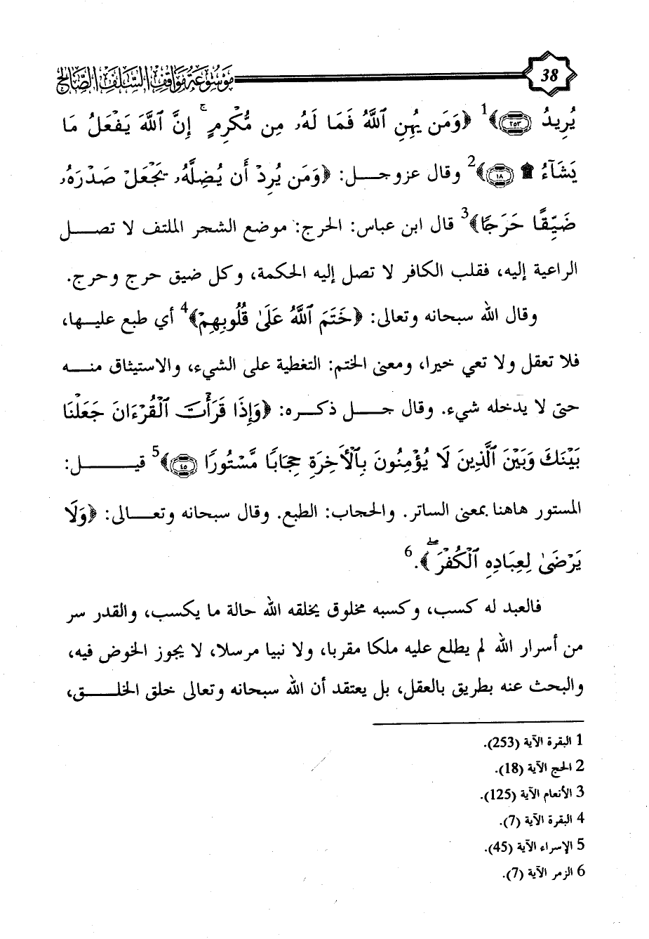 وقال الله سبحانه وتعالى: {خَتَمَ اللَّهُ عَلَى قُلُوبِهِمْ} (¬4) أي طبع عليها، فلا تعقل ولا تعي خيرا، ومعنى الختم: التغطية على الشيء، والاستيثاق منه حتى لا يدخله شيء. وقال جل ذكره: {وَإِذَا قَرَأْتَ الْقُرْآَنَ جَعَلْنَا بَيْنَكَ وَبَيْنَ الَّذِينَ لَا يُؤْمِنُونَ بِالْآَخِرَةِ حِجَابًا مَسْتُورًا (45)} (¬5) قيل: المستور هاهنا بمعنى الساتر. والحجاب: الطبع. وقال سبحانه وتعالى: {وَلَا يَرْضَى لِعِبَادِهِ الْكُفْرَ}. (¬6)