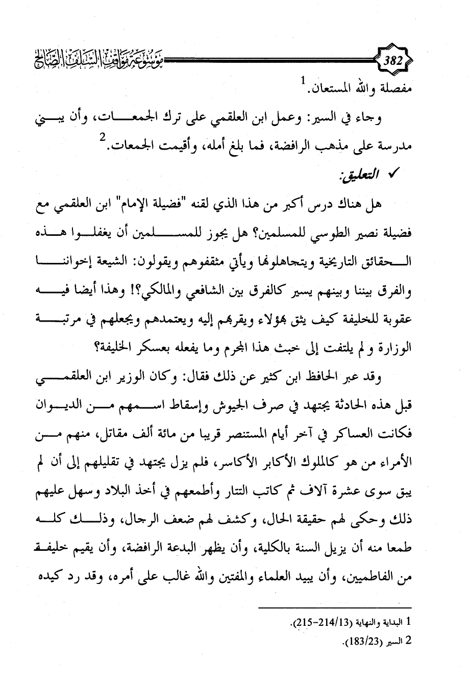 هل هناك درس أكبر من هذا الذي لقنه "فضيلة الإمام" ابن العلقمي مع فضيلة نصير الطوسي للمسلمين؟ هل يجوز للمسلمين أن يغفلوا هذه الحقائق التاريخية ويتجاهلونها ويأتي مثقفوهم ويقولون: الشيعة إخواننا والفرق بيننا وبينهم يسير كالفرق بين الشافعي والمالكي؟! وهذا أيضا فيه عقوبة للخليفة كيف يثق بهؤلاء ويقربهم إليه ويعتمدهم ويجعلهم في مرتبة الوزارة ولم يلتفت إلى خبث هذا المجرم وما يفعله بعسكر الخليفة؟