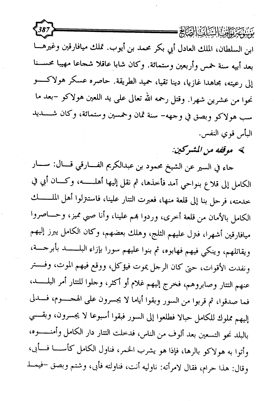 جاء في السير عن الشيخ محمود بن عبد الكريم الفارقي قال: سار الكامل إلى قلاع بنواحي آمد فأخذها، ثم نقل إليها أهله، وكان أبي في خدمته، فرحل بنا إلى قلعة منها، فعبرت التتار علينا، فاستنزلوا أهل الملك الكامل بالأمان من قلعة أخرى، وردوا بهم علينا، وأنا صبي مميز، وحاصروا ميافارقين أشهرا، فنزل عليهم الثلج، وهلك بعضهم، وكان الكامل يبرز إليهم ويقاتلهم، وينكي فيهم فهابوه، ثم بنوا عليهم سورا بإزاء البلد بأبرجة، ونفدت الأقوات، حتى كان الرجل يموت فيؤكل، ووقع فيهم الموت، وفتر عنهم التتار وصابروهم، فخرج إليهم غلام أو أكثر، وجلوا للتتار أمر البلد، فما صدقوا، ثم قربوا من السور وبقوا أياما لا يجسرون على الهجوم، فدلى إليهم مملوك للكامل حبالا فطلعوا إلى السور فبقوا أسبوعا لا يجسرون، وبقي بالبلد نحو التسعين بعد ألوف من الناس، فدخلت التتار دار الكامل وأمنوه، وأتوا به هولاكو بالرها، فإذا هو يشرب الخمر، فناول الكامل كأسا فأبى، وقال: هذا حرام، فقال لامرأته: ناوليه أنت، فناولته فأبى، وشتم وبصق -فيما