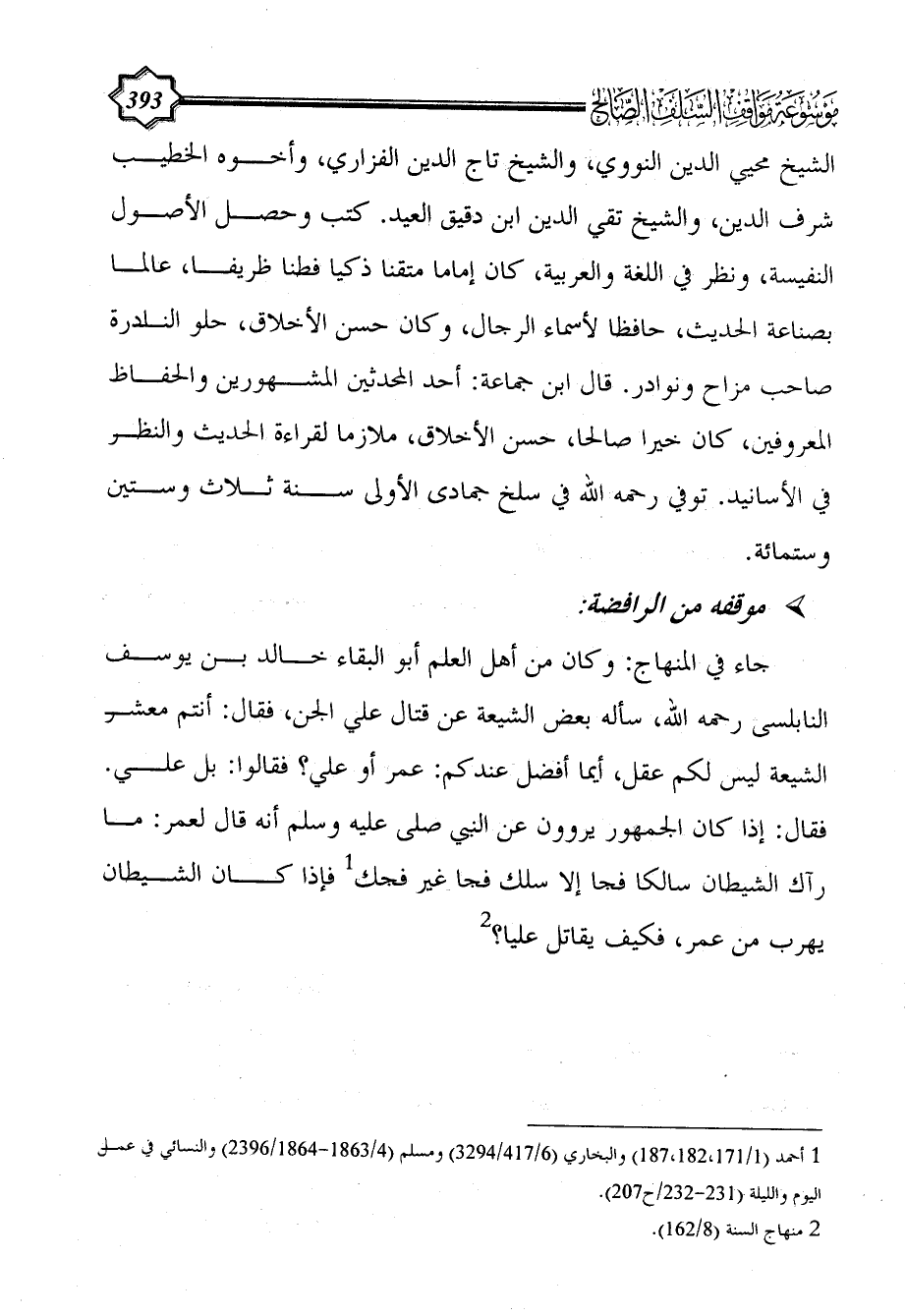 جاء في المنهاج: وكان من أهل العلم أبو البقاء خالد بن يوسف النابلسى رحمه الله، سأله بعض الشيعة عن قتال علي الجن، فقال: أنتم معشر الشيعة ليس لكم عقل، أيما أفضل عندكم: عمر أو علي؟ فقالوا: بل علي. فقال: إذا كان الجمهور يروون عن النبي صلى عليه وسلم أنه قال لعمر: ما رآك الشيطان سالكا فجا إلا سلك فجا غير فجك (¬1) فإذا كان الشيطان يهرب من عمر، فكيف يقاتل عليا؟ (¬2)