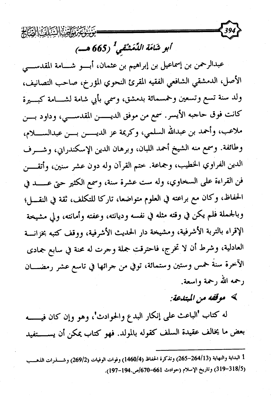 عبد الرحمن بن إسماعيل بن إبراهيم بن عثمان، أبو شامة المقدسي الأصل، الدمشقي الشافعي الفقيه المقرئ النحوي المؤرخ، صاحب التصانيف، ولد سنة تسع وتسعين وخمسمائة بدمشق، وسمي بأبي شامة لشامة كبيرة كانت فوق حاجبه الأيسر. سمع من موفق الدين المقدسي، وداود بن ملاعب، وأحمد بن عبد الله السلمي، وكريمة عز الدين بن عبد السلام، وطائفة. وسمع منه الشيخ أحمد اللبان، وبرهان الدين الإسكندراني، وشرف الدين الفراوي الخطيب، وجماعة. ختم القرآن وله دون عشر سنين، وأتقن فن القراءة على السخاوي، وله ست عشرة سنة، وسمع الكثير حتى عد في الحفاظ، وكان مع براعته في العلوم متواضعا، تاركا للتكلف، ثقة في النقل؛ وبالجملة فلم يكن في وقته مثله في نفسه وديانته، وعفته وأمانته، ولي مشيخة الإقراء بالتربة الأشرفية، ومشيخة دار الحديث الأشرفية، ووقف كتبه بخزانة العادلية، وشرط أن لا تخرج، فاحترقت جملة وجرت له محنة في سابع جمادى الآخرة سنة خمس وستين وستمائة، توفي من جرائها في تاسع عشر رمضان رحمه الله رحمة واسعة.
