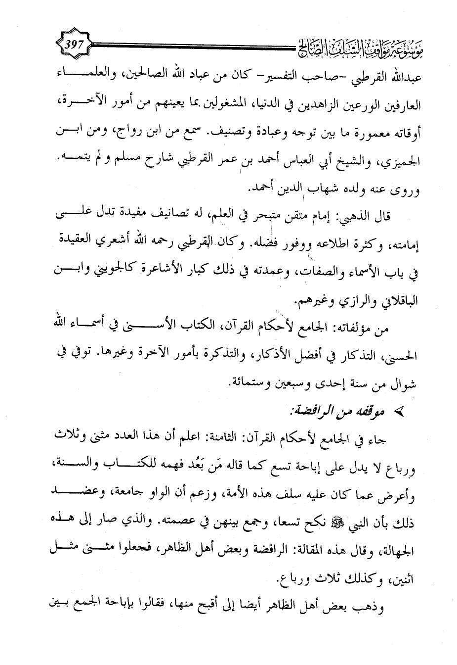 جاء في الجامع لأحكام القرآن: الثامنة: اعلم أن هذا العدد مثنى وثلاث ورباع لا يدل على إباحة تسع كما قاله مَن بَعُد فهمه للكتاب والسنة، وأعرض عما كان عليه سلف هذه الأمة، وزعم أن الواو جامعة، وعضد ذلك بأن النبي - صلى الله عليه وسلم - نكح تسعا، وجمع بينهن في عصمته. والذي صار إلى هذه الجهالة، وقال هذه المقالة: الرافضة وبعض أهل الظاهر، فجعلوا مثنى مثل اثنين، وكذلك ثلاث ورباع.