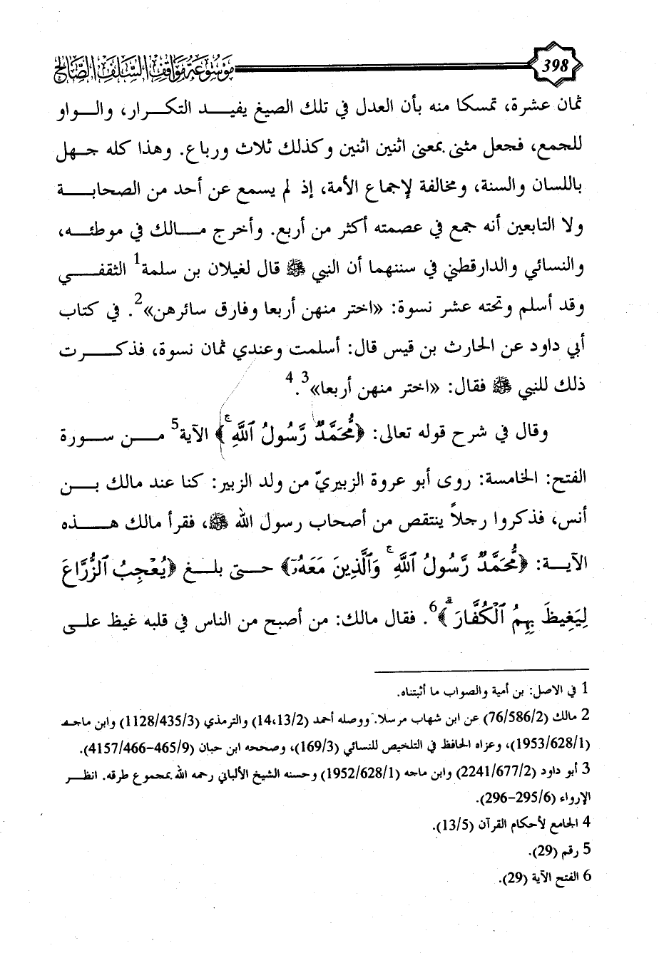ثمان عشرة، تمسكا منه بأن العدل في تلك الصيغ يفيد التكرار، والواو للجمع، فجعل مثنى بمعنى اثنين اثنين وكذلك ثلاث ورباع. وهذا كله جهل باللسان والسنة، ومخالفة لإجماع الأمة، إذ لم يسمع عن أحد من الصحابة ولا التابعين أنه جمع في عصمته أكثر من أربع. وأخرج مالك في موطئه، والنسائي والدارقطني في سننهما أن النبي - صلى الله عليه وسلم - قال لغيلان بن سلمة (¬1) الثقفي وقد أسلم وتحته عشر نسوة: «اختر منهن أربعا وفارق سائرهن» (¬2). في كتاب أبي داود عن الحارث بن قيس قال: أسلمت وعندي ثمان نسوة، فذكرت ذلك للنبي - صلى الله عليه وسلم - فقال: «اختر منهن أربعا» (¬3). (¬4)