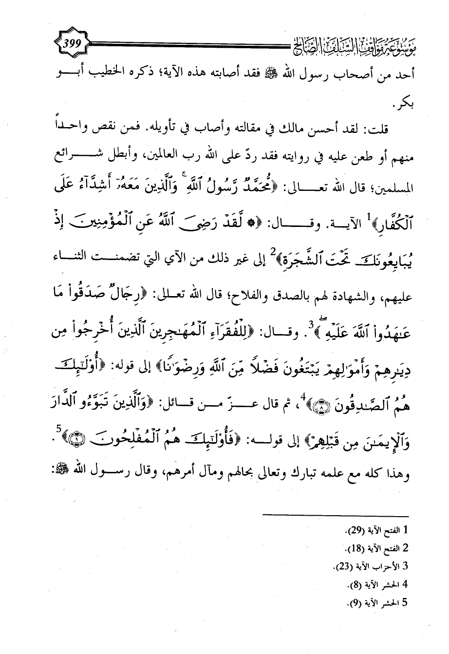 قلت: لقد أحسن مالك في مقالته وأصاب في تأويله. فمن نقص واحداً منهم أو طعن عليه في روايته فقد ردّ على الله رب العالمين، وأبطل شرائع المسلمين؛ قال الله تعالى: {مُحَمَّدٌ رَسُولُ اللَّهِ وَالَّذِينَ مَعَهُ أَشِدَّاءُ عَلَى الْكُفَّارِ} (¬1) الآية. وقال: {* لَقَدْ رَضِيَ اللَّهُ عَنِ الْمُؤْمِنِينَ إِذْ يُبَايِعُونَكَ تَحْتَ الشَّجَرَةِ} (¬2) إلى غير ذلك من الآي التي تضمنت الثناء عليهم، والشهادة لهم بالصدق والفلاح؛ قال الله تعالى: {رِجَالٌ صَدَقُوا مَا عَاهَدُوا اللَّهَ عَلَيْهِ} (¬3). وقال: {لِلْفُقَرَاءِ الْمُهَاجِرِينَ الَّذِينَ أُخْرِجُوا مِنْ دِيَارِهِمْ وَأَمْوَالِهِمْ يَبْتَغُونَ فَضْلًا مِنَ اللَّهِ وَرِضْوَانًا} إلى قوله: {أُولَئِكَ هُمُ الصَّادِقُونَ (8)} (¬4)، ثم قال عزّ من قائل: {وَالَّذِينَ تَبَوَّءُوا الدَّارَ وَالْإِيمَانَ مِنْ قَبْلِهِمْ} إلى قوله: {فَأُولَئِكَ هُمُ الْمُفْلِحُونَ (9)} (¬5). وهذا كله مع علمه تبارك وتعالى بحالهم ومآل أمرهم، وقال رسول الله - صلى الله عليه وسلم -: