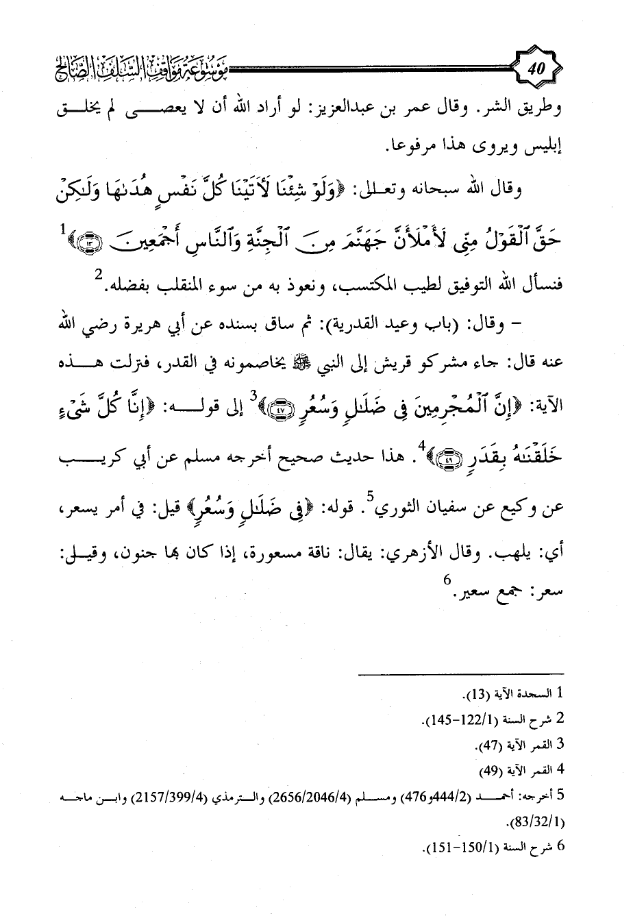 وقال الله سبحانه وتعالى: {وَلَوْ شِئْنَا لَآَتَيْنَا كُلَّ نَفْسٍ هُدَاهَا وَلَكِنْ حَقَّ الْقَوْلُ مِنِّي لَأَمْلَأَنَّ جَهَنَّمَ مِنَ الْجِنَّةِ وَالنَّاسِ أَجْمَعِينَ (13)} (¬1) فنسأل الله التوفيق لطيب المكتسب، ونعوذ به من سوء المنقلب بفضله. (¬2)