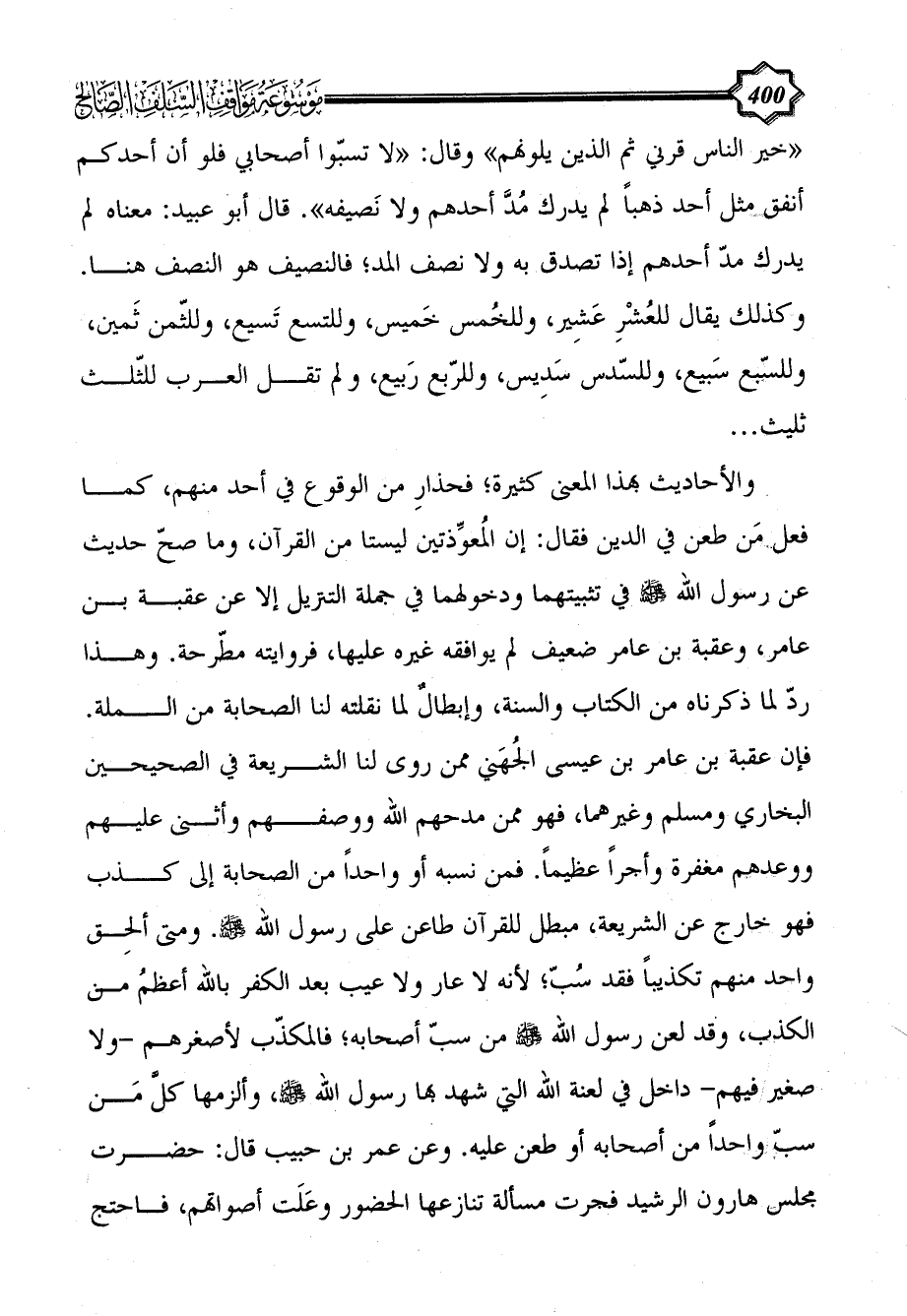 والأحاديث بهذا المعنى كثيرة؛ فحذارِ من الوقوع في أحد منهم، كما فعل مَن طعن في الدين فقال: إن المُعوِّذتين ليستا من القرآن، وما صحّ حديث عن رسول الله - صلى الله عليه وسلم - في تثبيتهما ودخولهما في جملة التنزيل إلا عن عقبة بن عامر، وعقبة بن عامر ضعيف لم يوافقه غيره عليها، فروايته مطّرحة. وهذا ردّ لما ذكرناه من الكتاب والسنة، وإبطالٌ لما نقلته لنا الصحابة من الملة. فإن عقبة بن عامر بن عيسى الجُهَني ممن روى لنا الشريعة في الصحيحين البخاري ومسلم وغيرهما، فهو ممن مدحهم الله ووصفهم وأثنى عليهم ووعدهم مغفرة وأجراً عظيماً. فمن نسبه أو واحداً من الصحابة إلى كذب فهو خارج عن الشريعة، مبطل للقرآن طاعن على رسول الله - صلى الله عليه وسلم -. ومتى ألحِق واحد منهم تكذيباً فقد سُبّ؛ لأنه لا عار ولا عيب بعد الكفر بالله أعظمُ من الكذب، وقد لعن رسول الله - صلى الله عليه وسلم - من سبّ أصحابه؛ فالمكذّب لأصغرهم -ولا صغير فيهم- داخل في لعنة الله التي شهد بها رسول الله - صلى الله عليه وسلم -، وألزمها كلَّ مَن سبّ واحداً من أصحابه أو طعن عليه.
