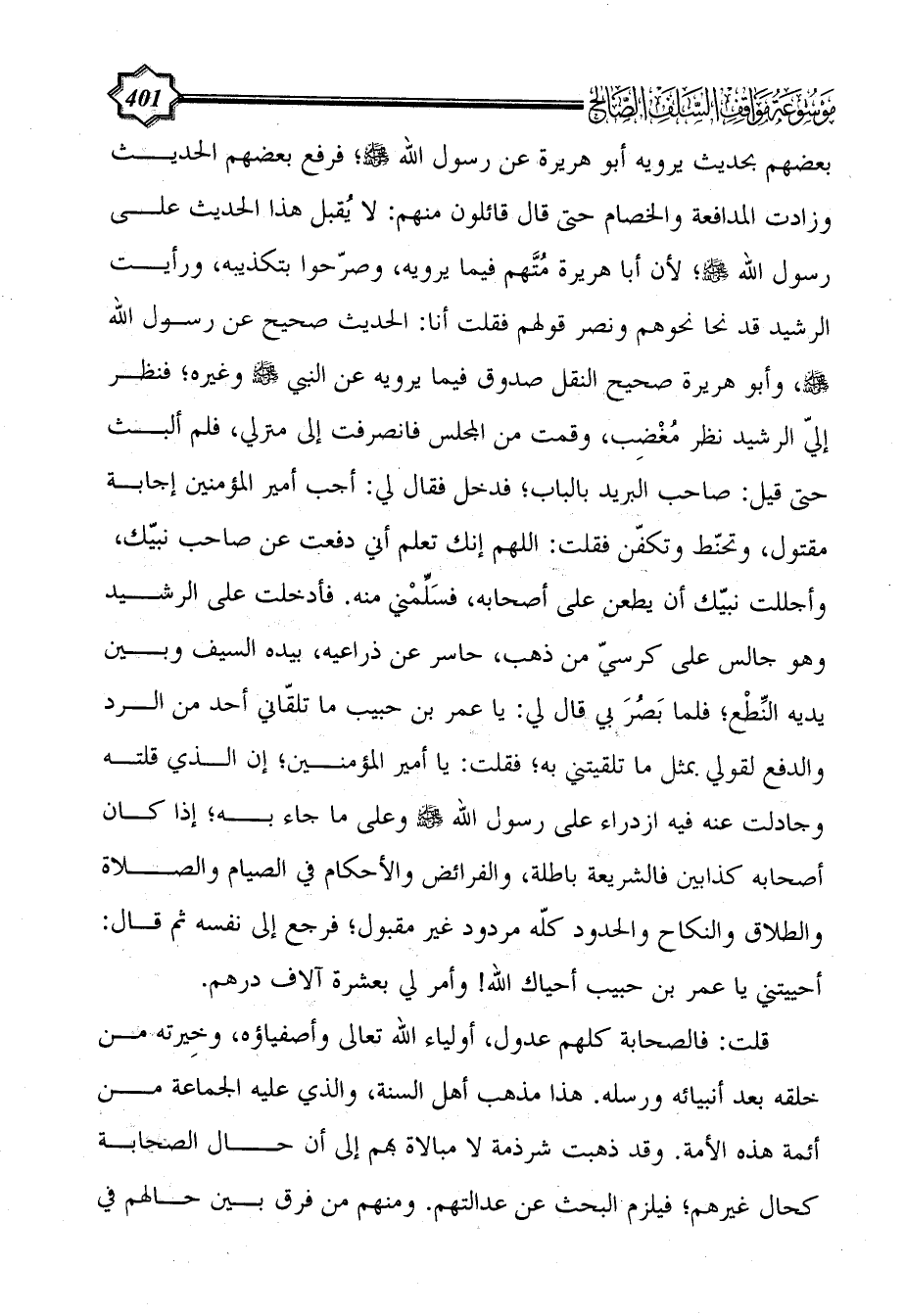 بعضهم بحديث يرويه أبو هريرة عن رسول الله - صلى الله عليه وسلم -؛ فرفع بعضهم الحديث وزادت المدافعة والخصام حتى قال قائلون منهم: لا يُقبل هذا الحديث على رسول الله - صلى الله عليه وسلم -؛ لأن أبا هريرة مُتَّهم فيما يرويه، وصرّحوا بتكذيبه، ورأيت الرشيد قد نحا نحوهم ونصر قولهم فقلت أنا: الحديث صحيح عن رسول الله - صلى الله عليه وسلم -، وأبو هريرة صحيح النقل صدوق فيما يرويه عن النبي - صلى الله عليه وسلم - وغيره؛ فنظر إليّ الرشيد نظر مُغْضِب، وقمت من المجلس فانصرفت إلى منزلي، فلم ألبث حتى قيل: صاحب البريد بالباب؛ فدخل فقال لي: أجب أمير المؤمنين إجابة مقتول، وتحنّط وتكفّن فقلت: اللهم إنك تعلم أني دفعت عن صاحب نبيّك، وأجللت نبيّك أن يطعن على أصحابه، فسَلِّمْني منه. فأدخلت على الرشيد وهو جالس على كرسيّ من ذهب، حاسر عن ذراعيه، بيده السيف وبين يديه النِّطْع؛ فلما بَصُرَ بي قال لي: يا عمر بن حبيب ما تلقّاني أحد من الرد والدفع لقولي بمثل ما تلقيتني به؛ فقلت: يا أمير المؤمنين؛ إن الذي قلته وجادلت عنه فيه ازدراء على رسول الله - صلى الله عليه وسلم - وعلى ما جاء به؛ إذا كان أصحابه كذابين فالشريعة باطلة، والفرائض والأحكام في الصيام والصلاة والطلاق والنكاح والحدود كلّه مردود غير مقبول؛ فرجع إلى نفسه ثم قال: أحييتني يا عمر بن حبيب أحياك الله! وأمر لي بعشرة آلاف درهم.