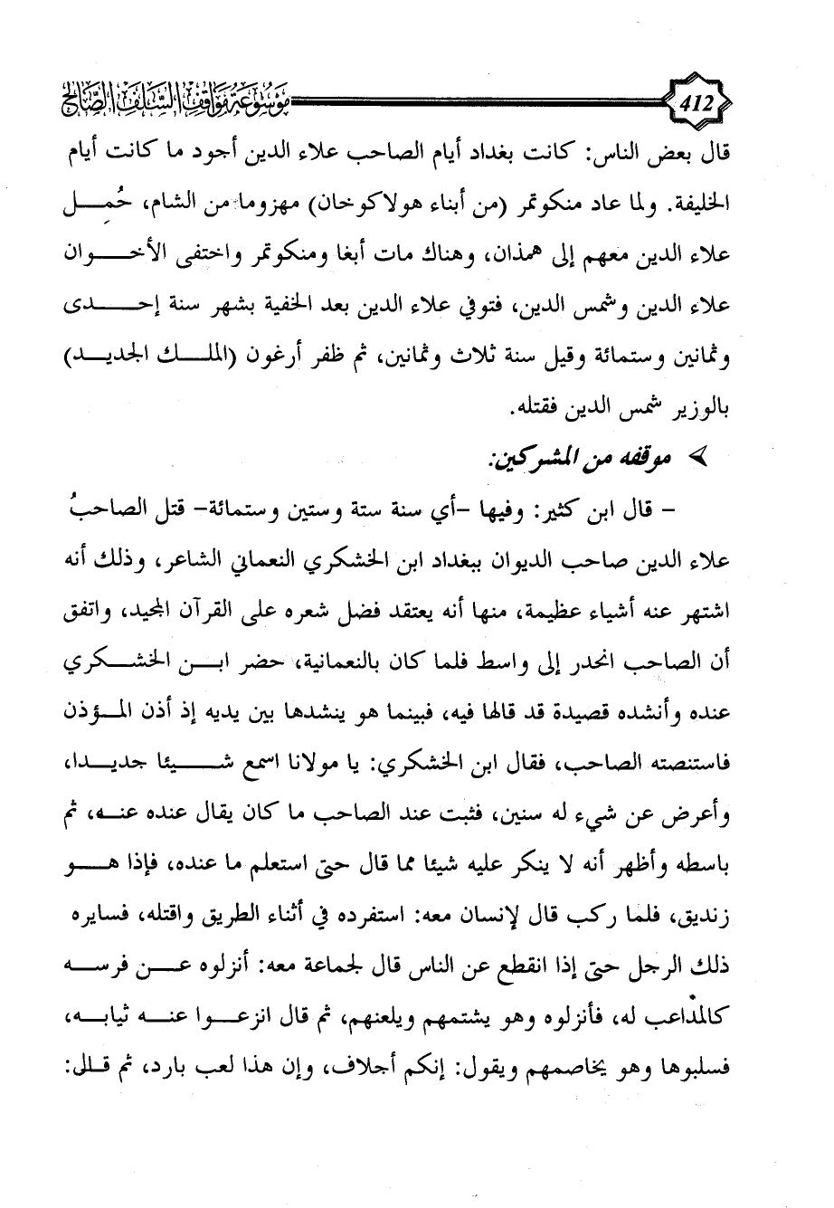 - قال ابن كثير: وفيها -أي سنة ستة وستين وستمائة- قتل الصاحبُ علاء الدين صاحب الديوان ببغداد ابن الخشكري النعماني الشاعر، وذلك أنه اشتهر عنه أشياء عظيمة، منها أنه يعتقد فضل شعره على القرآن المجيد، واتفق أن الصاحب انحدر إلى واسط فلما كان بالنعمانية، حضر ابن الخشكري عنده وأنشده قصيدة قد قالها فيه، فبينما هو ينشدها بين يديه إذ أذن المؤذن فاستنصته الصاحب، فقال ابن الخشكري: يا مولانا اسمع شيئا جديدا، وأعرض عن شيء له سنين، فثبت عند الصاحب ما كان يقال عنده عنه، ثم باسطه وأظهر أنه لا ينكر عليه شيئا مما قال حتى استعلم ما عنده، فإذا هو زنديق، فلما ركب قال لإنسان معه: استفرده في أثناء الطريق واقتله، فسايره ذلك الرجل حتى إذا انقطع عن الناس قال لجماعة معه: أنزلوه عن فرسه كالمداعب له، فأنزلوه وهو يشتمهم ويلعنهم، ثم قال انزعوا عنه ثيابه، فسلبوها وهو يخاصمهم ويقول: إنكم أجلاف، وإن هذا لعب بارد، ثم قال: