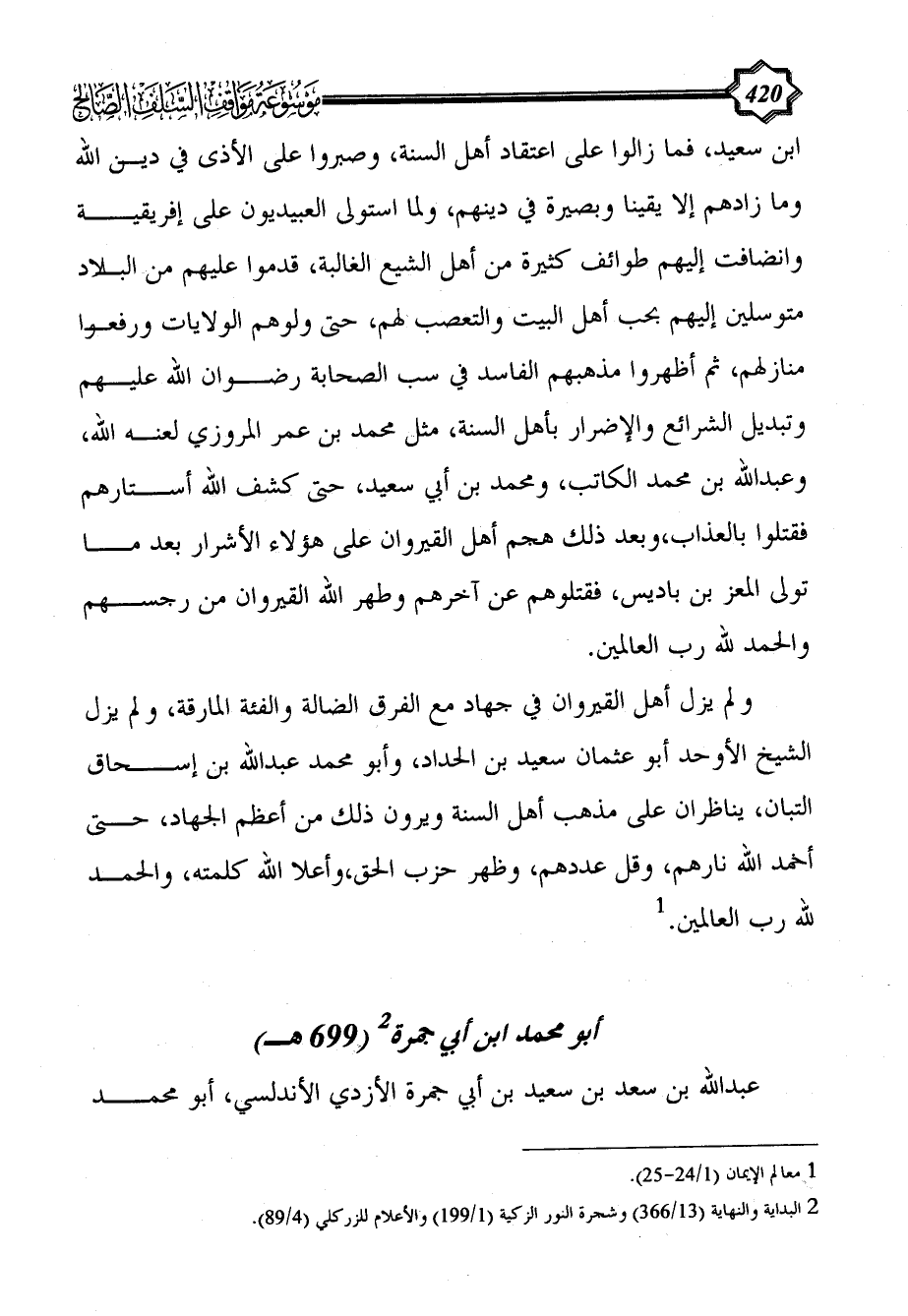 ابن سعيد، فما زالوا على اعتقاد أهل السنة، وصبروا على الأذى في دين الله وما زادهم إلا يقينا وبصيرة في دينهم، ولما استولى العبيديون على إفريقية وانضافت إليهم طوائف كثيرة من أهل الشيع الغالبة، قدموا عليهم من البلاد متوسلين إليهم بحب أهل البيت والتعصب لهم، حتى ولوهم الولايات ورفعوا منازلهم، ثم أظهروا مذهبهم الفاسد في سب الصحابة رضوان الله عليهم وتبديل الشرائع والإضرار بأهل السنة، مثل محمد بن عمر المروزي لعنه الله، وعبد الله بن محمد الكاتب، ومحمد بن أبي سعيد، حتى كشف الله أستارهم فقتلوا بالعذاب، وبعد ذلك هجم أهل القيروان على هؤلاء الأشرار بعد ما تولى المعز بن باديس، فقتلوهم عن آخرهم وطهر الله القيروان من رجسهم والحمد لله رب العالمين.