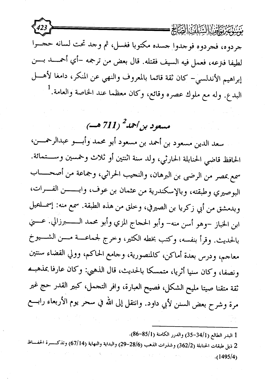 سعد الدين مسعود بن أحمد بن مسعود أبو محمد وأبو عبد الرحمن، الحافظ قاضي الحنابلة الحارثي، ولد سنة اثنتين أو ثلاث وخمسين وستمائة. سمع بمصر من الرضى بن البرهان، والنجيب الحراثي، وجماعة من أصحاب البوصيري وطبقته، وبالإسكندرية من عثمان بن عوف، وابن الفرات، وبدمشق من أبي زكريا بن الصيرفي، وخلق من هذه الطبقة. سمع منه: إسماعيل ابن الخباز -وهو أسن منه- وأبو الحجاج المزي وأبو محمد البرزالي. عني بالحديث. وقرأ بنفسه، وكتب بخطه الكثير، وخرج لجماعة من الشيوخ معاجم، ودرس بعدة أماكن، كالمنصورية، وجامع الحاكم، وولي القضاء سنتين ونصفا، وكان سنيا أثريا، متمسكا بالحديث، قال الذهبي: وكان عارفا بمذهبه ثقة متقنا صيتا مليح الشكل، فصيح العبارة، وافر التجمل، كبير القدر حج غير مرة وشرح بعض السنن لأبي داود. وانتقل إلى الله في سحر يوم الأربعاء رابع