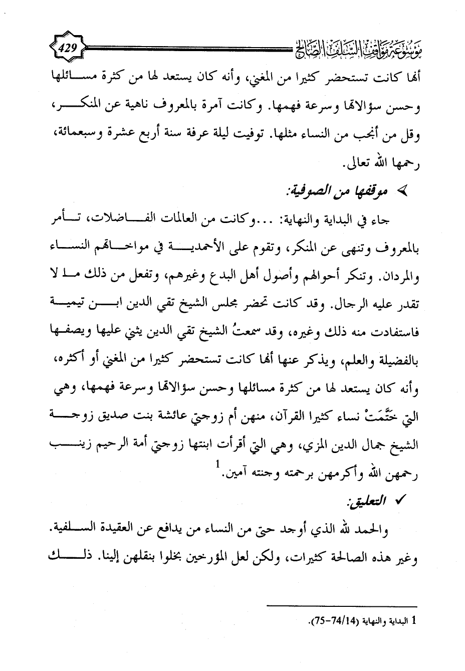 والحمد لله الذي أوجد حتى من النساء من يدافع عن العقيدة السلفية. وغير هذه الصالحة كثيرات، ولكن لعل المؤرخين بخلوا بنقلهن إلينا. ذلك