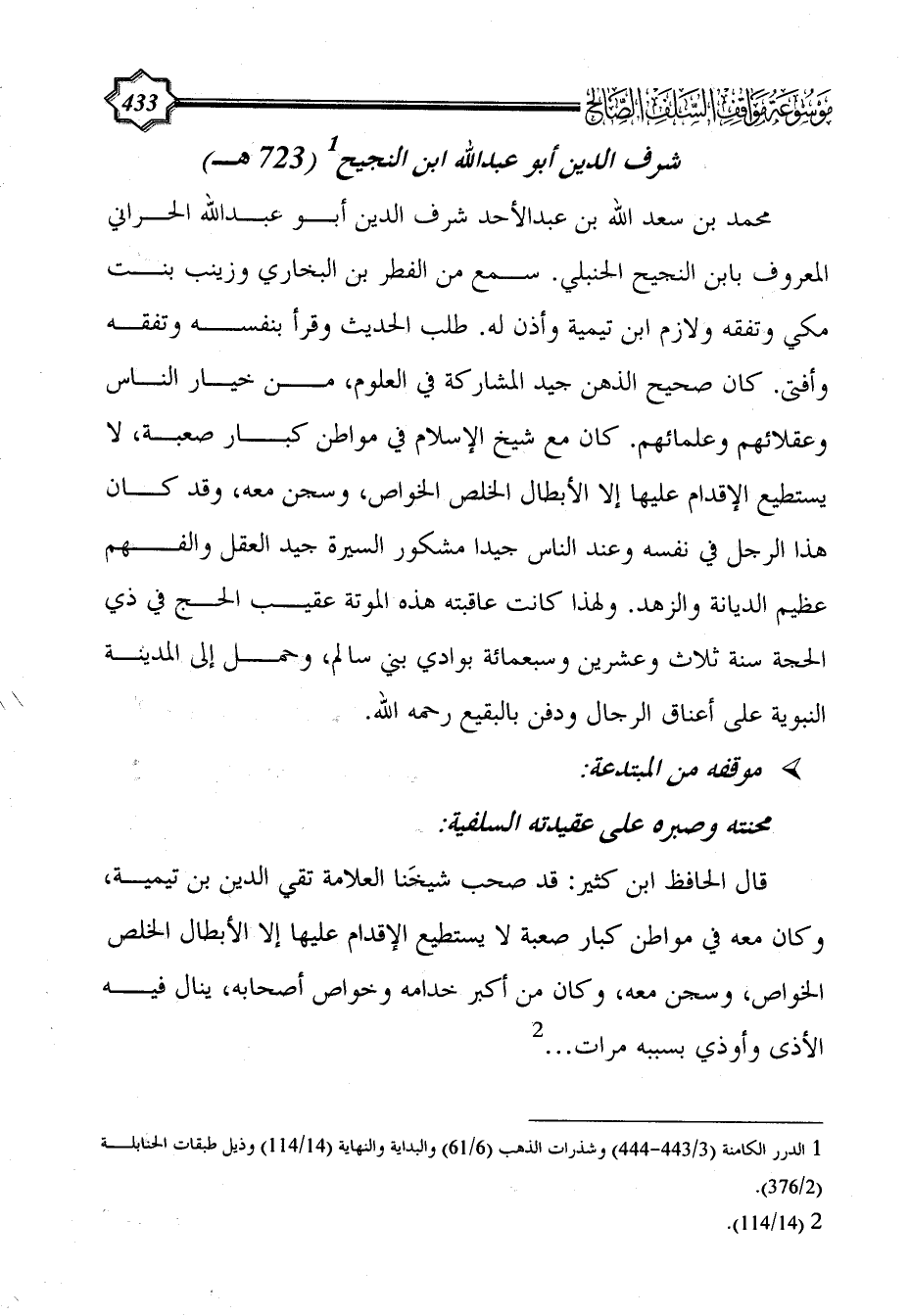 محمد بن سعد الله بن عبد الأحد شرف الدين أبو عبد الله الحراني المعروف بابن النجيح الحنبلي. سمع من الفطر بن البخاري وزينب بنت مكي وتفقه ولازم ابن تيمية وأذن له. طلب الحديث وقرأ بنفسه وتفقه وأفتى. كان صحيح الذهن جيد المشاركة في العلوم، من خيار الناس وعقلائهم وعلمائهم. كان مع شيخ الإسلام في مواطن كبار صعبة، لا يستطيع الإقدام عليها إلا الأبطال الخلص الخواص، وسجن معه، وقد كان هذا الرجل في نفسه وعند الناس جيدا مشكور السيرة جيد العقل والفهم عظيم الديانة والزهد. ولهذا كانت عاقبته هذه الموتة عقيب الحج في ذي الحجة سنة ثلاث وعشرين وسبعمائة بوادي بني سالم، وحمل إلى المدينة النبوية على أعناق الرجال ودفن بالبقيع رحمه الله.