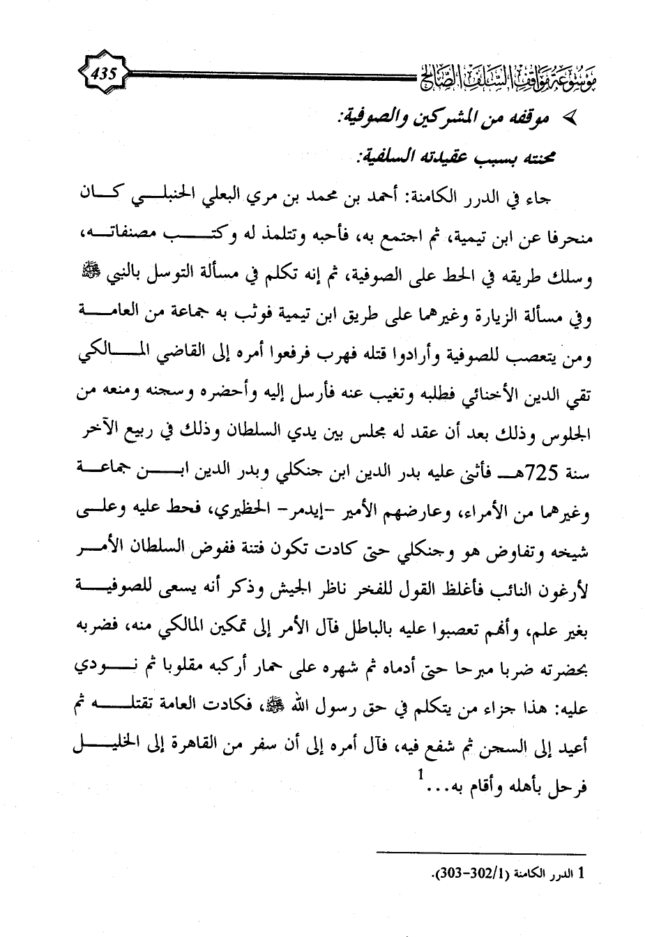 جاء في الدرر الكامنة: أحمد بن محمد بن مري البعلي الحنبلي كان منحرفا عن ابن تيمية، ثم اجتمع به، فأحبه وتتلمذ له وكتب مصنفاته، وسلك طريقه في الحط على الصوفية، ثم إنه تكلم في مسألة التوسل بالنبي - صلى الله عليه وسلم - وفي مسألة الزيارة وغيرهما على طريق ابن تيمية فوثب به جماعة من العامة ومن يتعصب للصوفية وأرادوا قتله فهرب فرفعوا أمره إلى القاضي المالكي تقي الدين الأخنائي فطلبه وتغيب عنه فأرسل إليه وأحضره وسجنه ومنعه من الجلوس وذلك بعد أن عقد له مجلس بين يدي السلطان وذلك في ربيع الآخر سنة 725هـ فأثنى عليه بدر الدين ابن جنكلي وبدر الدين ابن جماعة وغيرهما من الأمراء، وعارضهم الأمير -إيدمر- الحظيري، فحط عليه وعلى شيخه وتفاوض هو وجنكلي حتى كادت تكون فتنة ففوض السلطان الأمر لأرغون النائب فأغلظ القول للفخر ناظر الجيش وذكر أنه يسعى للصوفية بغير علم، وأنهم تعصبوا عليه بالباطل فآل الأمر إلى تمكين المالكي منه، فضربه بحضرته ضربا مبرحا حتى أدماه ثم شهره على حمار أركبه مقلوبا ثم نودي عليه: هذا جزاء من يتكلم في حق رسول الله - صلى الله عليه وسلم -، فكادت العامة تقتله ثم أعيد إلى السجن ثم شفع فيه، فآل أمره إلى أن سفر من القاهرة إلى الخليل فرحل بأهله وأقام به ... (¬1)