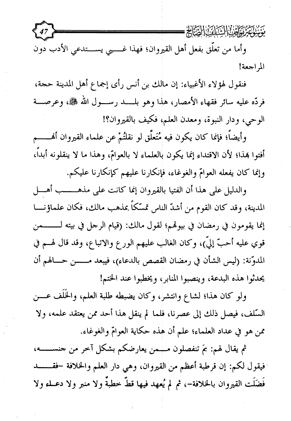 وأيضاً؛ فإنما كان يكون فيه مُتَعلَّق لو نقلتُمْ عن علماء القيروان أنهم أفتوا بهذا؛ لأن الاقتداء إنما يكون بالعلماء لا بالعوامّ، وهذا ما لا ينقلونه أبداً، وإنما كان يفعله العوامّ والغوغاء، فإنكارنا عليهم كإنكارنا عليكم.