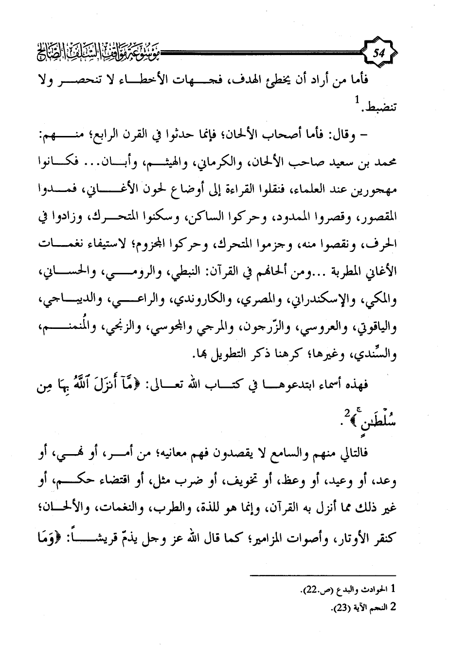 - وقال: فأما أصحاب الألحان؛ فإنما حدثوا في القرن الرابع؛ منهم: محمد بن سعيد صاحب الألحان، والكرماني، والهيثم، وأبان ... فكانوا مهجورين عند العلماء، فنقلوا القراءة إلى أوضاع لحون الأغاني، فمدوا المقصور، وقصروا الممدود، وحركوا الساكن، وسكنوا المتحرك، وزادوا في الحرف، ونقصوا منه، وجزموا المتحرك، وحركوا المجزوم؛ لاستيفاء نغمات الأغاني المطربة ... ومن ألحانهم في القرآن: النبطي، والرومي، والحساني، والمكي، والإسكندراني، والمصري، والكاروندي، والراعي، والديباجي، والياقوتي، والعروسي، والزّرجون، والمرجي والمجوسي، والزنجي، والمُنمنم، والسِّندي، وغيرها؛ كرهنا ذكر التطويل بها.
