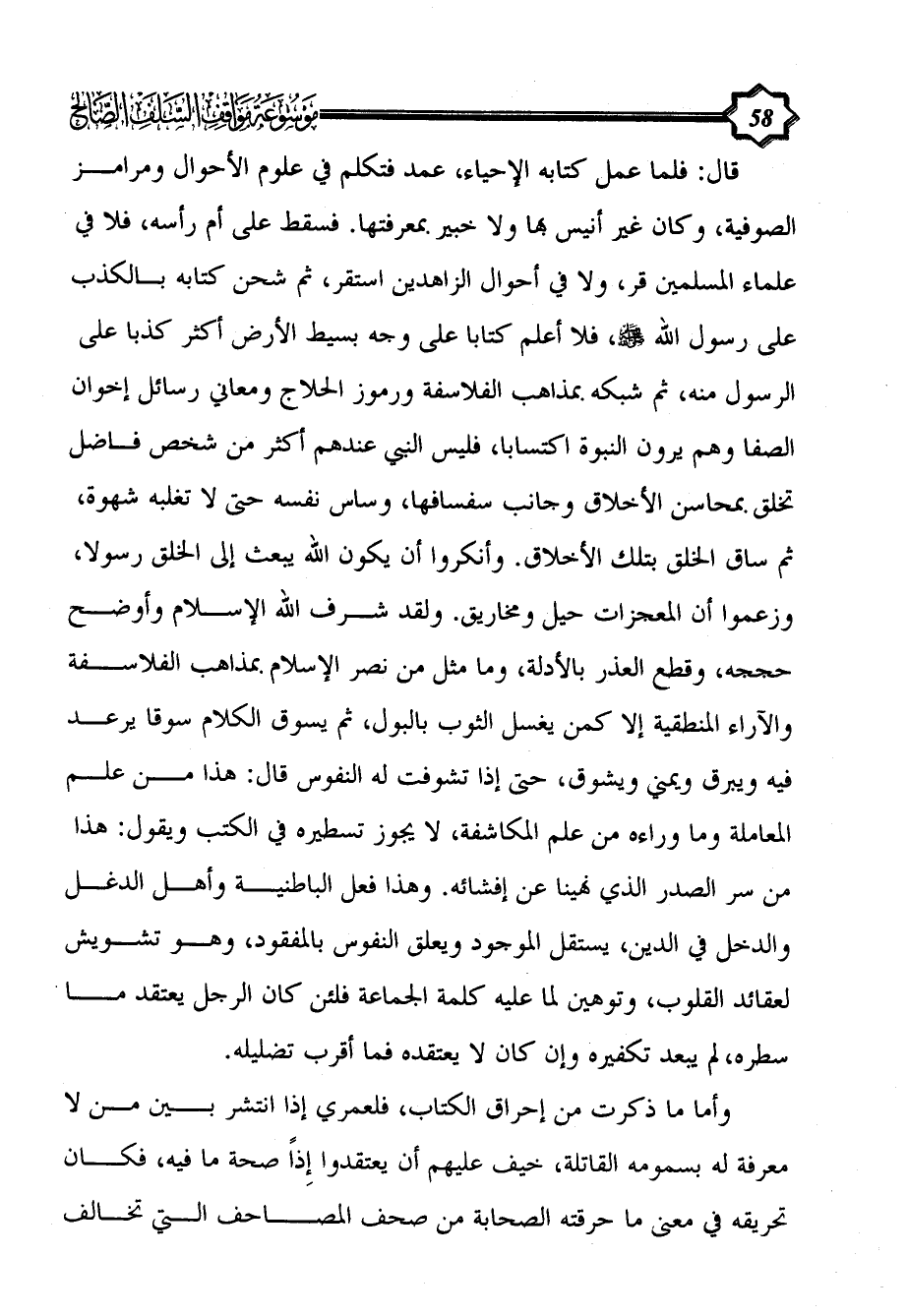 قال: فلما عمل كتابه الإحياء، عمد فتكلم في علوم الأحوال ومرامز الصوفية، وكان غير أنيس بها ولا خبير بمعرفتها. فسقط على أم رأسه، فلا في علماء المسلمين قر، ولا في أحوال الزاهدين استقر، ثم شحن كتابه بالكذب على رسول الله - صلى الله عليه وسلم -، فلا أعلم كتابا على وجه بسيط الأرض أكثر كذبا على الرسول منه، ثم شبكه بمذاهب الفلاسفة ورموز الحلاج ومعاني رسائل إخوان الصفا وهم يرون النبوة اكتسابا، فليس النبي عندهم أكثر من شخص فاضل تخلق بمحاسن الأخلاق وجانب سفسافها، وساس نفسه حتى لا تغلبه شهوة، ثم ساق الخلق بتلك الأخلاق. وأنكروا أن يكون الله يبعث إلى الخلق رسولا، وزعموا أن المعجزات حيل ومخاريق. ولقد شرف الله الإسلام وأوضح حججه، وقطع العذر بالأدلة، وما مثل من نصر الإسلام بمذاهب الفلاسفة والآراء المنطقية إلا كمن يغسل الثوب بالبول، ثم يسوق الكلام سوقا يرعد فيه ويبرق ويمني ويشوق، حتى إذا تشوفت له النفوس قال: هذا من علم المعاملة وما وراءه من علم المكاشفة، لا يجوز تسطيره في الكتب ويقول: هذا من سر الصدر الذي نهينا عن إفشائه. وهذا فعل الباطنية وأهل الدغل والدخل في الدين، يستقل الموجود ويعلق النفوس بالمفقود، وهو تشويش لعقائد القلوب، وتوهين لما عليه كلمة الجماعة فلئن كان الرجل يعتقد ما سطره، لم يبعد تكفيره وإن كان لا يعتقده فما أقرب تضليله.