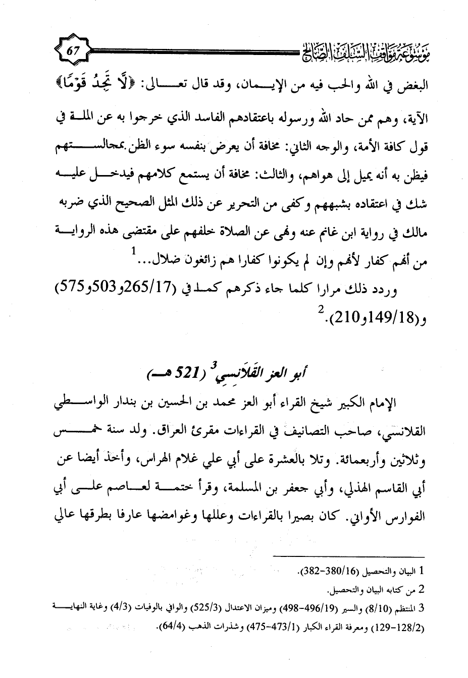 الإمام الكبير شيخ القراء أبو العز محمد بن الحسين بن بندار الواسطي القلانسي، صاحب التصانيف في القراءات مقرئ العراق. ولد سنة خمس وثلاثين وأربعمائة. وتلا بالعشرة على أبي علي غلام الهراس، وأخذ أيضا عن أبي القاسم الهذلي، وأبي جعفر بن المسلمة، وقرأ ختمة لعاصم على أبي الفوارس الأواني. كان بصيرا بالقراءات وعللها وغوامضها عارفا بطرقها عالي