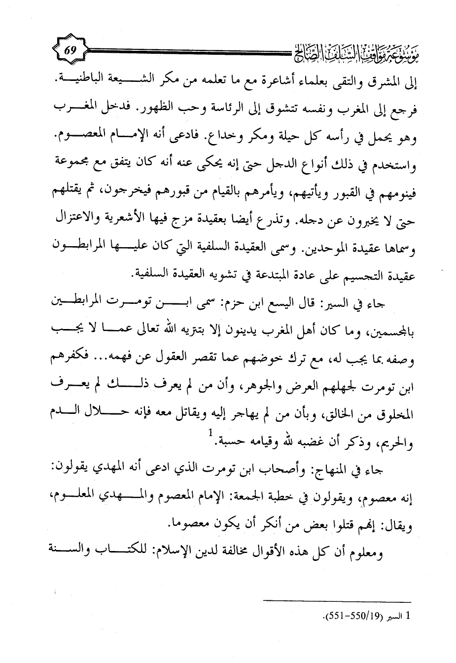 جاء في المنهاج: وأصحاب ابن تومرت الذي ادعى أنه المهدي يقولون: إنه معصوم، ويقولون في خطبة الجمعة: الإمام المعصوم والمهدي المعلوم، ويقال: إنهم قتلوا بعض من أنكر أن يكون معصوما.