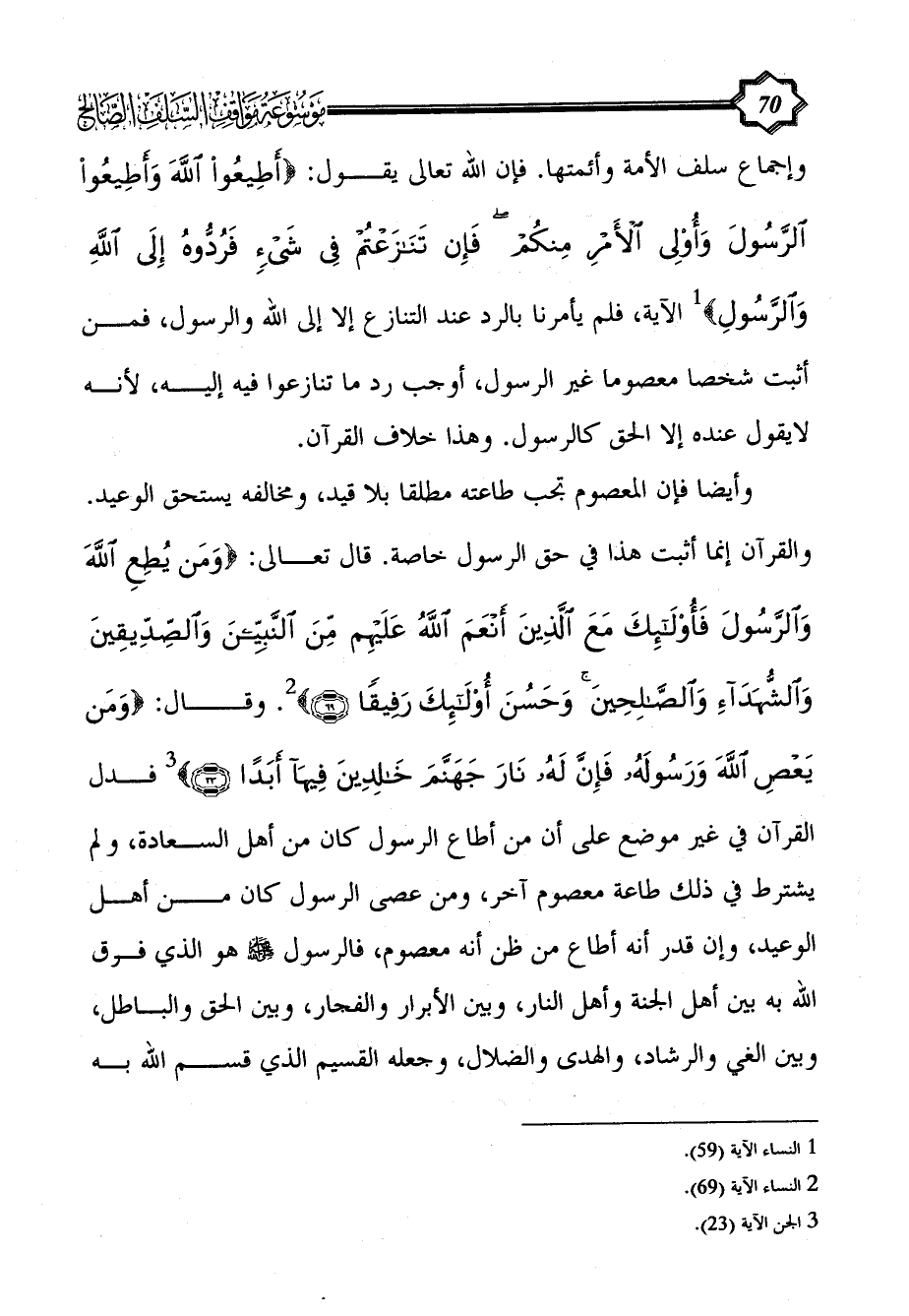 وأيضا فإن المعصوم تجب طاعته مطلقا بلا قيد، ومخالفه يستحق الوعيد. والقرآن إنما أثبت هذا في حق الرسول خاصة. قال تعالى: {وَمَنْ يُطِعِ اللَّهَ وَالرَّسُولَ فَأُولَئِكَ مَعَ الَّذِينَ أَنْعَمَ اللَّهُ عَلَيْهِمْ مِنَ النَّبِيِّينَ وَالصِّدِّيقِينَ وَالشُّهَدَاءِ وَالصَّالِحِينَ وَحَسُنَ أُولَئِكَ رَفِيقًا (69)} (¬2). وقال: {وَمَنْ يَعْصِ اللَّهَ وَرَسُولَهُ فَإِنَّ لَهُ نَارَ جَهَنَّمَ خَالِدِينَ فِيهَا أَبَدًا (23)} (¬3) فدل القرآن في غير موضع على أن من أطاع الرسول كان من أهل السعادة، ولم يشترط في ذلك طاعة معصوم آخر، ومن عصى الرسول كان من أهل الوعيد، وإن قدر أنه أطاع من ظن أنه معصوم، فالرسول - صلى الله عليه وسلم - هو الذي فرق الله به بين أهل الجنة وأهل النار، وبين الأبرار والفجار، وبين الحق والباطل، وبين الغي والرشاد، والهدى والضلال، وجعله القسيم الذي قسم الله به