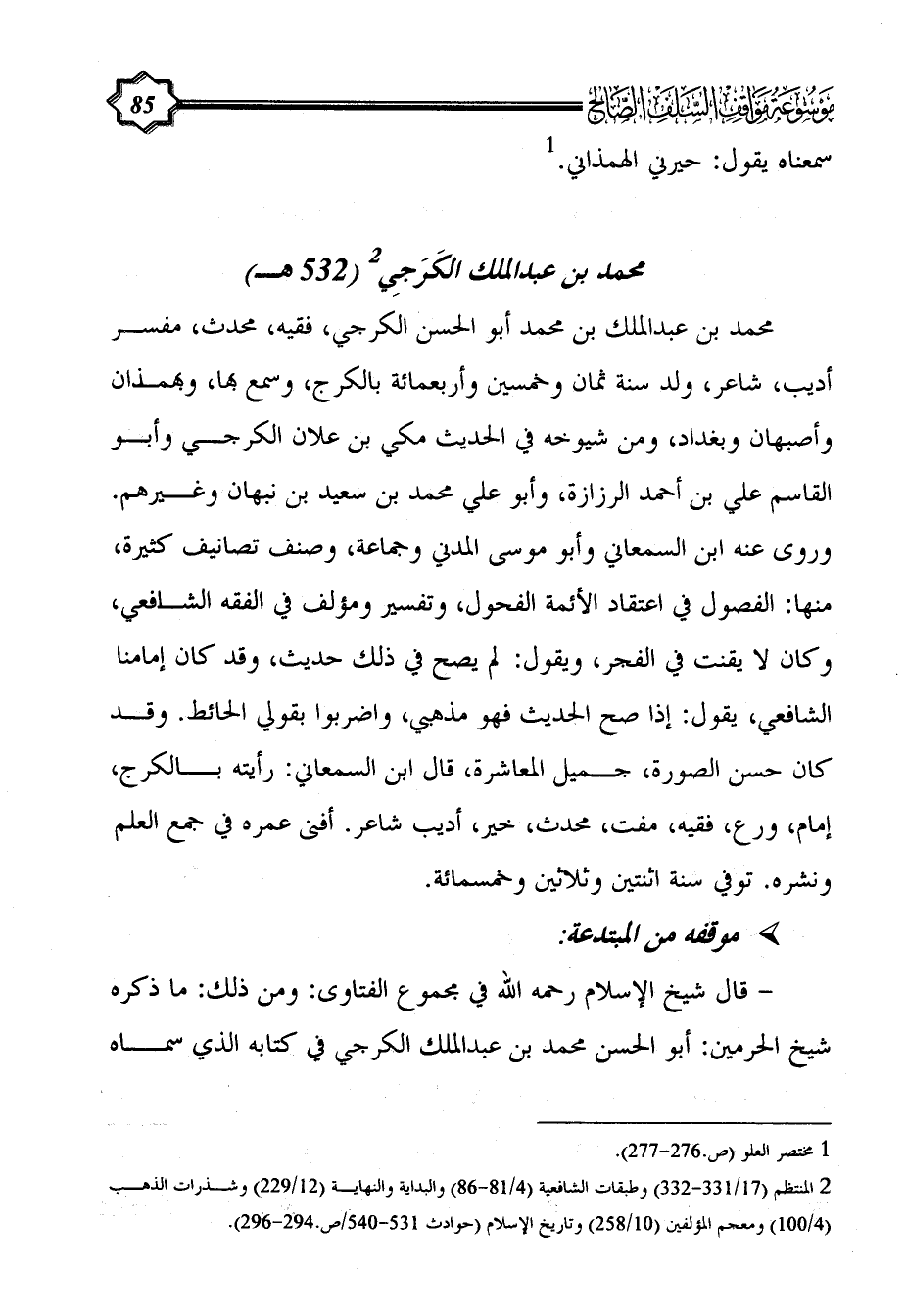 - قال شيخ الإسلام رحمه الله في مجموع الفتاوى: ومن ذلك: ما ذكره شيخ الحرمين: أبو الحسن محمد بن عبد الملك الكرجي في كتابه الذي سماه