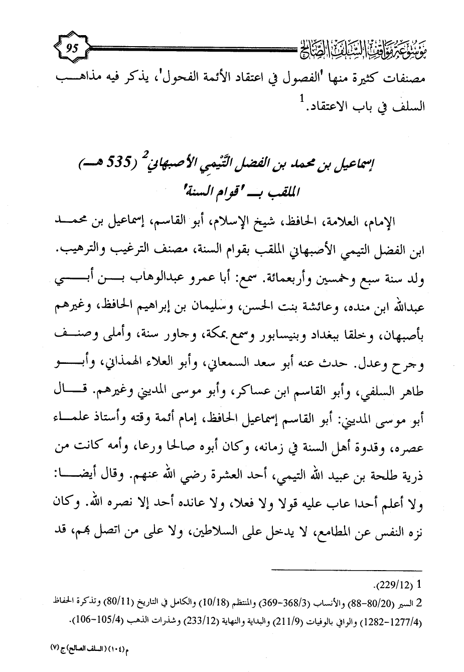الإمام، العلامة، الحافظ، شيخ الإسلام، أبو القاسم، إسماعيل بن محمد ابن الفضل التيمي الأصبهاني الملقب بقوام السنة، مصنف الترغيب والترهيب. ولد سنة سبع وخمسين وأربعمائة. سمع: أبا عمرو عبد الوهاب بن أبي عبد الله ابن منده، وعائشة بنت الحسن، وسليمان بن إبراهيم الحافظ، وغيرهم بأصبهان، وخلقا ببغداد وبنيسابور وسمع بمكة، وجاور سنة، وأملى وصنف وجرح وعدل. حدث عنه أبو سعد السمعاني، وأبو العلاء الهمذاني، وأبو طاهر السلفي، وأبو القاسم ابن عساكر، وأبو موسى المديني وغيرهم. قال أبو موسى المديني: أبو القاسم إسماعيل الحافظ، إمام أئمة وقته وأستاذ علماء عصره، وقدوة أهل السنة في زمانه، وكان أبوه صالحا ورعا، وأمه كانت من ذرية طلحة بن عبيد الله التيمي، أحد العشرة رضي الله عنهم. وقال أيضا: ولا أعلم أحدا عاب عليه قولا ولا فعلا، ولا عانده أحد إلا نصره الله. وكان نزه النفس عن المطامع، لا يدخل على السلاطين، ولا على من اتصل بهم، قد