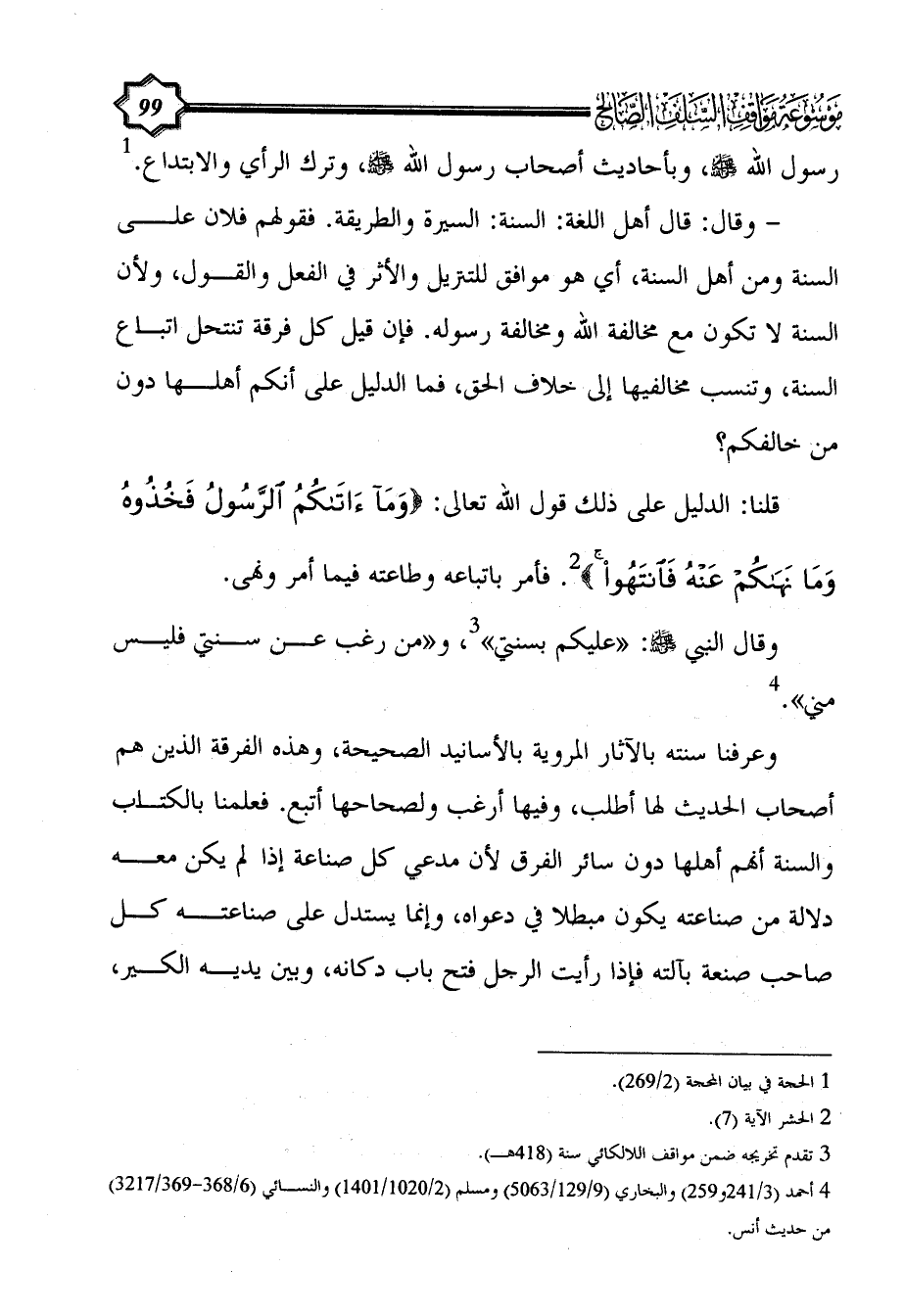 - وقال: قال أهل اللغة: السنة: السيرة والطريقة. فقولهم فلان على السنة ومن أهل السنة، أي هو موافق للتنزيل والأثر في الفعل والقول، ولأن السنة لا تكون مع مخالفة الله ومخالفة رسوله. فإن قيل كل فرقة تنتحل اتباع السنة، وتنسب مخالفيها إلى خلاف الحق، فما الدليل على أنكم أهلها دون من خالفكم؟