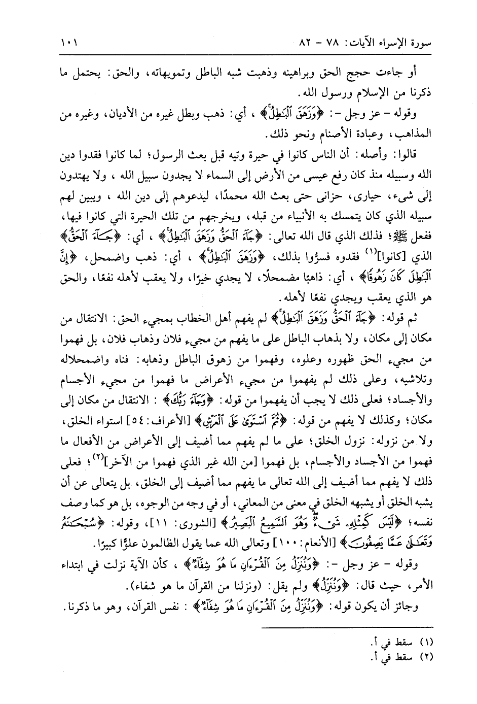 ثم قوله: (جَاءَ الْحَقُّ وَزَهَقَ الْبَاطِلُ) لم يفهم أهل الخطاب بمجيء الحق: الانتقال من مكان إلى مكان، ولا بذهاب الباطل على ما يفهم من مجيء فلان وذهاب فلان، بل فهموا من مجيء الحق ظهوره وعلوه، وفهموا من زهوق الباطل وذهابه: فناه واضمحلاله وتلاشيه، وعلى ذلك لم يفهموا من مجيء الأعراض ما فهموا من مجيء الأجسام والأجساد؛ فعلى ذلك لا يجب أن يفهموا من قوله: (وَجَاءَ رَبُّكَ): الانتقال من مكان إلى مكان؛ وكذلك لا يفهم من قوله: (ثُمَ اسْتَوَى عَلَى العرشِ) استواء الخلق، ولا من نزوله: نزول الخلق؛ على ما لم يفهم مما أضيف إلى الأعراض من الأفعال ما فهموا من الأجساد والأجسام، بل فهموا من اللَّه غير الذي فهموا من الآخر؛ فعلى ذلك لا يفهم مما أضيف إلى اللَّه تعالى ما يفهم مما أضيف إلى الخلق، بل يتعالى عن أن يشبه الخلق أو يشبهه الخلق في معنى من المعاني، أو في وجه من الوجوه، بل هو كما وصف نفسه؛ (لَيْسَ كَمِثْلِهِ شَيْءٌ وَهُوَ السَّمِيعُ الْبَصِيرُ)، وقوله: (سُبْحَانَهُ وَتَعَالَى عَمَّا يَصِفُونَ)، وتعالى اللَّه عما يقول الظالمون علوًّا كبيرًا.
