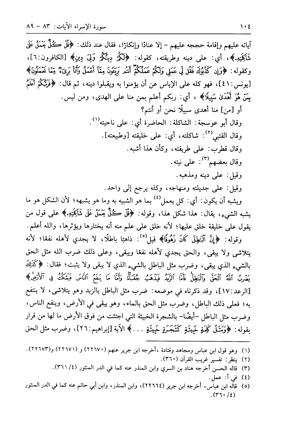 آياته عليهم وإقامة حججه عليهم - إلا عنادًا وإنكارًا، فقال عند ذلك: (قُلْ كُلٌّ يَعْمَلُ عَلَى شَاكِلَتِهِ)، أي: على دينه وطريقته، كقوله: (لَكُمْ دِينُكُمْ وَلِيَ دِينِ)، وكقوله: (وَإِنْ كَذَّبُوكَ فَقُلْ لِي عَمَلِي وَلَكُمْ عَمَلُكُمْ أَنْتُمْ بَرِيئُونَ مِمَّا أَعْمَلُ وَأَنَا بَرِيءٌ مِمَّا تَعْمَلُونَ) فهو كله على الإياس عن أن يؤمنوا به ويقبلوا دينه، ثم قال: (فَرَبُّكُمْ أَعْلَمُ بِمَنْ هُوَ أَهْدَى سَبِيلًا)، أي: ربكم أعلم بمن منا على الهدى، ومن ليس.