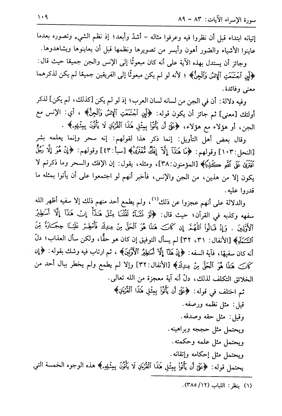 وفيه دلالة: أن في الجن من لسانه لسان العرب؛ إذ لو لم يكن كذلك لم يكن لذكر أُولَئِكَ معنى، ثم جائز أن يكون قوله: (لَئِنِ اجْتَمَعَتِ الْإِنْسُ وَالْجِنُّ)، أي: الإنس مع الجن، أو هَؤُلَاءِ مع هَؤُلَاءِ، (عَلَى أَنْ يَأْتُوا بِمِثْلِ هَذَا الْقُرْآنِ لَا يَأْتُونَ بِمِثْلِهِ).
