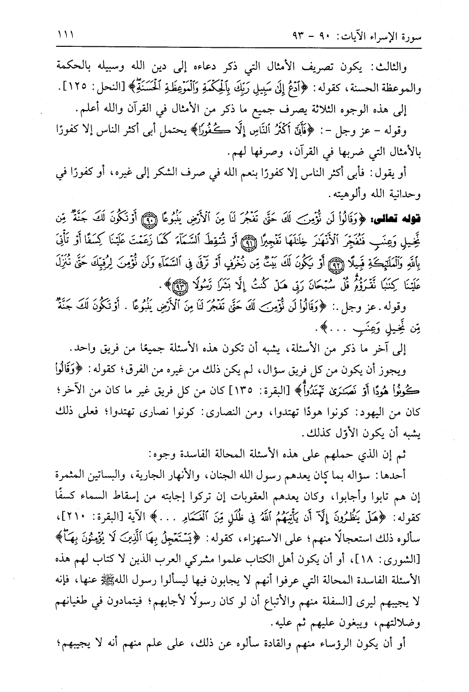 قوله تعالى: (وَقَالُوا لَنْ نُؤْمِنَ لَكَ حَتَّى تَفْجُرَ لَنَا مِنَ الْأَرْضِ يَنْبُوعًا (90) أَوْ تَكُونَ لَكَ جَنَّةٌ مِنْ نَخِيلٍ وَعِنَبٍ فَتُفَجِّرَ الْأَنْهَارَ خِلَالَهَا تَفْجِيرًا (91) أَوْ تُسْقِطَ السَّمَاءَ كَمَا زَعَمْتَ عَلَيْنَا كِسَفًا أَوْ تَأْتِيَ بِاللَّهِ وَالْمَلَائِكَةِ قَبِيلًا (92) أَوْ يَكُونَ لَكَ بَيْتٌ مِنْ زُخْرُفٍ أَوْ تَرْقَى فِي السَّمَاءِ وَلَنْ نُؤْمِنَ لِرُقِيِّكَ حَتَّى تُنَزِّلَ عَلَيْنَا كِتَابًا نَقْرَؤُهُ قُلْ سُبْحَانَ رَبِّي هَلْ كُنْتُ إِلَّا بَشَرًا رَسُولًا (93)