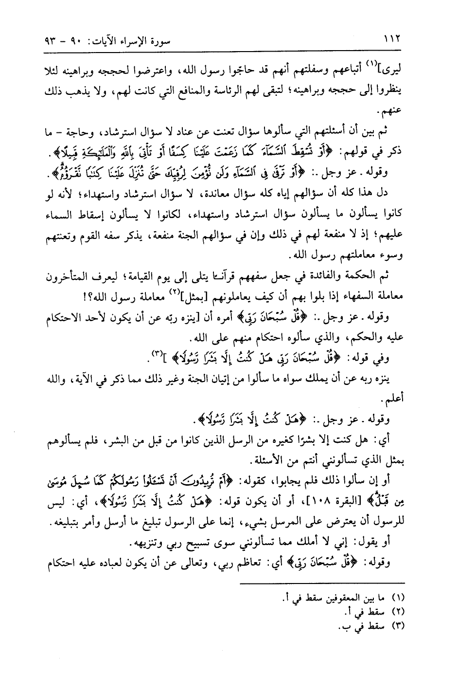 وقوله. عَزَّ وَجَلَّ.: (قُلْ سُبْحَانَ رَبِّي) أمره أن ينزه ربه عن أن يكون لأحد الاحتكام عليه والحكم، والذي سألوه احتكام منهم على اللَّه.