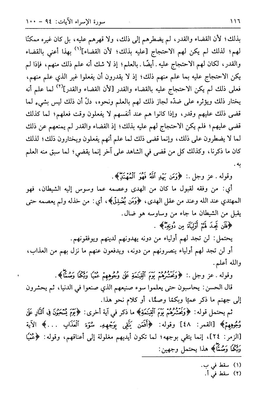 وقوله. عَزَّ وَجَلَّ.: (وَمَنْ يَهْدِ اللَّهُ فَهُوَ الْمُهْتَدِ وَمَنْ يُضْلِلْ فَلَنْ تَجِدَ لَهُمْ أَوْلِيَاءَ مِنْ دُونِهِ وَنَحْشُرُهُمْ يَوْمَ الْقِيَامَةِ عَلَى وُجُوهِهِمْ عُمْيًا وَبُكْمًا وَصُمًّا مَأْوَاهُمْ جَهَنَّمُ كُلَّمَا خَبَتْ زِدْنَاهُمْ سَعِيرًا (97)