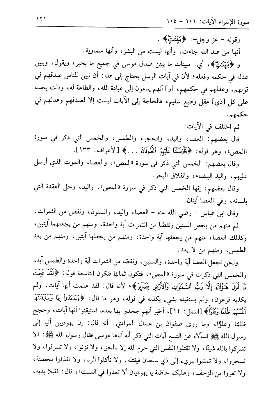 ونحن نجعل العصا آية واحدة، والسنين، ونقصًا من الثمرات آية واحدة والطمس آية، والخمس التي ذكرت في سورة " المص "، فتكون ثمانيًا فتكون التاسعة قوله: (قَالَ لَقَدْ عَلِمْتَ مَا أَنْزَلَ هَؤُلَاءِ إِلَّا رَبُّ السَّمَاوَاتِ وَالْأَرْضِ بَصَائِرَ)؛ لأنه قال: لقد علمت أنها آيات، ولم يكذبه فرعون، ولم يستقبله بشيء يكذبه في قوله، وهو ما قال: (وَجَحَدُوا بِهَا وَاسْتَيْقَنَتْهَا أَنْفُسُهُمْ ظُلْمًا وَعُلُوًّا)، أخبر أنهم جحدوا بها بعدما استيقنوا أنها آيات، وحجج ظلمًا وعلوًّا، وما روى صفوان بن عسال المرادي: أنه قال: إن يهوديين أتيا إلى رسول اللَّه - صَلَّى اللَّهُ عَلَيهِ وَسَلَّمَ - فسألاه عن التسع آيات التي ذكر أنه آتاها موسى فقال رسول اللَّه - صَلَّى اللَّهُ عَلَيهِ وَسَلَّمَ -: " لا تشركوا باللَّه شيئًا، ولا تقتلوا النفس التي حرم اللَّه إلا بالحق، ولا تزنوا، ولا تسرقوا، ولا تسحروا، ولا تمشوا ببريء إلى ذي سلطان فيقتله، ولا تأكلوا الربا، ولا تقذفوا محصنة، ولا تفروا من الزحف، وعليكم خاصة يا يهوديان أَلَّا تَعْدُوا فِي السَّبْتِ "، قال: فقبَّلا يديه،
