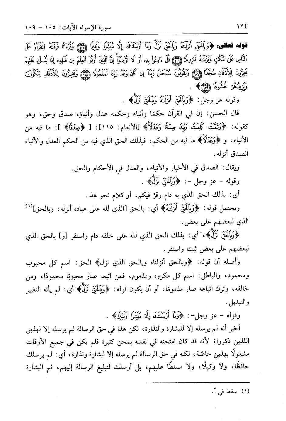 قوله تعالى: (وَبِالْحَقِّ أَنْزَلْنَاهُ وَبِالْحَقِّ نَزَلَ وَمَا أَرْسَلْنَاكَ إِلَّا مُبَشِّرًا وَنَذِيرًا (105) وَقُرْآنًا فَرَقْنَاهُ لِتَقْرَأَهُ عَلَى النَّاسِ عَلَى مُكْثٍ وَنَزَّلْنَاهُ تَنْزِيلًا (106) قُلْ آمِنُوا بِهِ أَوْ لَا تُؤْمِنُوا إِنَّ الَّذِينَ أُوتُوا الْعِلْمَ مِنْ قَبْلِهِ إِذَا يُتْلَى عَلَيْهِمْ يَخِرُّونَ لِلْأَذْقَانِ سُجَّدًا (107) وَيَقُولُونَ سُبْحَانَ رَبِّنَا إِنْ كَانَ وَعْدُ رَبِّنَا لَمَفْعُولًا (108) وَيَخِرُّونَ لِلْأَذْقَانِ يَبْكُونَ وَيَزِيدُهُمْ خُشُوعًا (109)