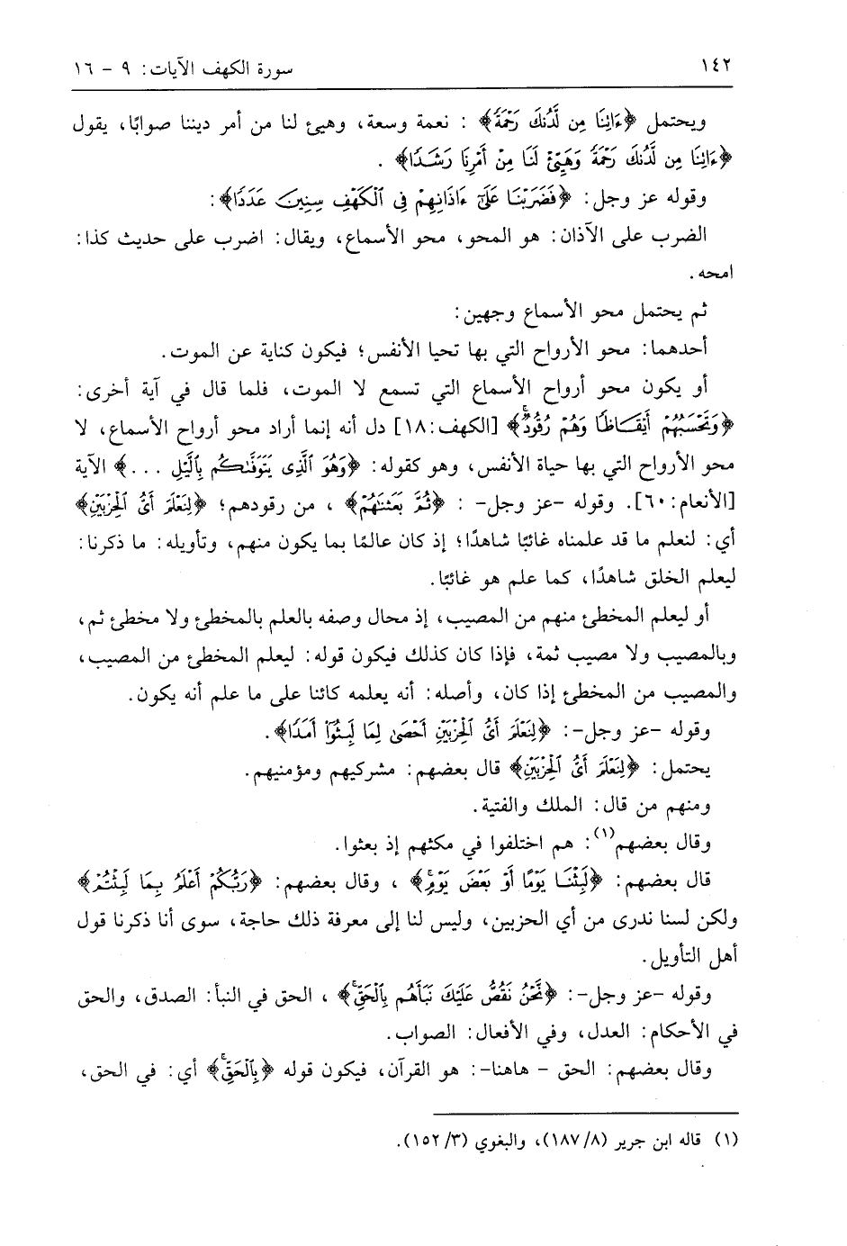 أو يكون محو أرواح الأسماع التي تسمع لا الموت، فلما قال في آية أخرى: (وَتَحْسَبُهُمْ أَيْقَاظًا وَهُمْ رُقُودٌ)، دل أنه إنما أراد محو أرواح الأسماع، لا محو الأرواح التي بها حياة الأنفس، وهو كقوله: (وَهُوَ الَّذِي يَتَوَفَّاكُمْ بِاللَّيْلِ. . .) الآية. وقوله - عَزَّ وَجَلَّ -: (ثُمَّ بَعَثْنَاهُمْ ... (12) من رقودهم؛ (لِنَعْلَمَ أَيُّ الْحِزْبَيْنِ) أي: لنعلم ما قد علمناه غائبًا شاهدًا؛ إذ كان عالمًا بما يكون منهم، وتأويله: ما ذكرنا: ليعلم الخلق شاهدًا، كما علم هو غائبًا.