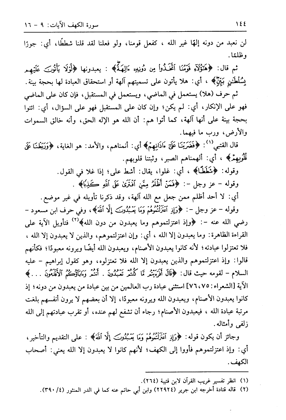 وقوله - عَزَّ وَجَلَّ -: (وَإِذِ اعْتَزَلْتُمُوهُمْ وَمَا يَعْبُدُونَ إِلَّا اللَّهَ ... (16) وفي حرف ابن مسعود - رَضِيَ اللَّهُ عَنْهُ -: (وإذ اعتزلتموهم وما يعبدون من دون الله) فتأويل الآية على القراءة الظاهرة: وما يعبدون إلا اللَّه، أي: وإن اعتزلتموهم، والذين لا يعبدون إلا اللَّه، فلا تعتزلوا عبادته؛ لأنه كانوا يعبدون الأصنام، ويعبدون اللَّه أيضا ويرونه معبودًا؛ فكأنهم قالوا: وإذ اعتزلتموهم والذين يعبدون إلا اللَّه فلا تعتزلوه، وهو كقول إبراهيم - عليه السلام - لقومه حيث قال: (قَالَ أَفَرَأَيْتُمْ مَا كُنْتُمْ تَعْبُدُونَ (75) أَنْتُمْ وَآبَاؤُكُمُ الْأَقْدَمُونَ (76). الآية، استثنى عبادة رب العالمين من بين عبادة من يعبدون من دونه؛ إذ كانوا يعبدون الأصنام، ويعبدون اللَّه ويرونه معبودًا، إلا أن بعضهم لا يرون أنفسهم بلغت مرتبة عبادة اللَّه، فيعبدون الأصنام؛ رجاء أن تشفع لهم عنده، أو تقرب عبادتهم إلى الله زلفى وأمثاله.
