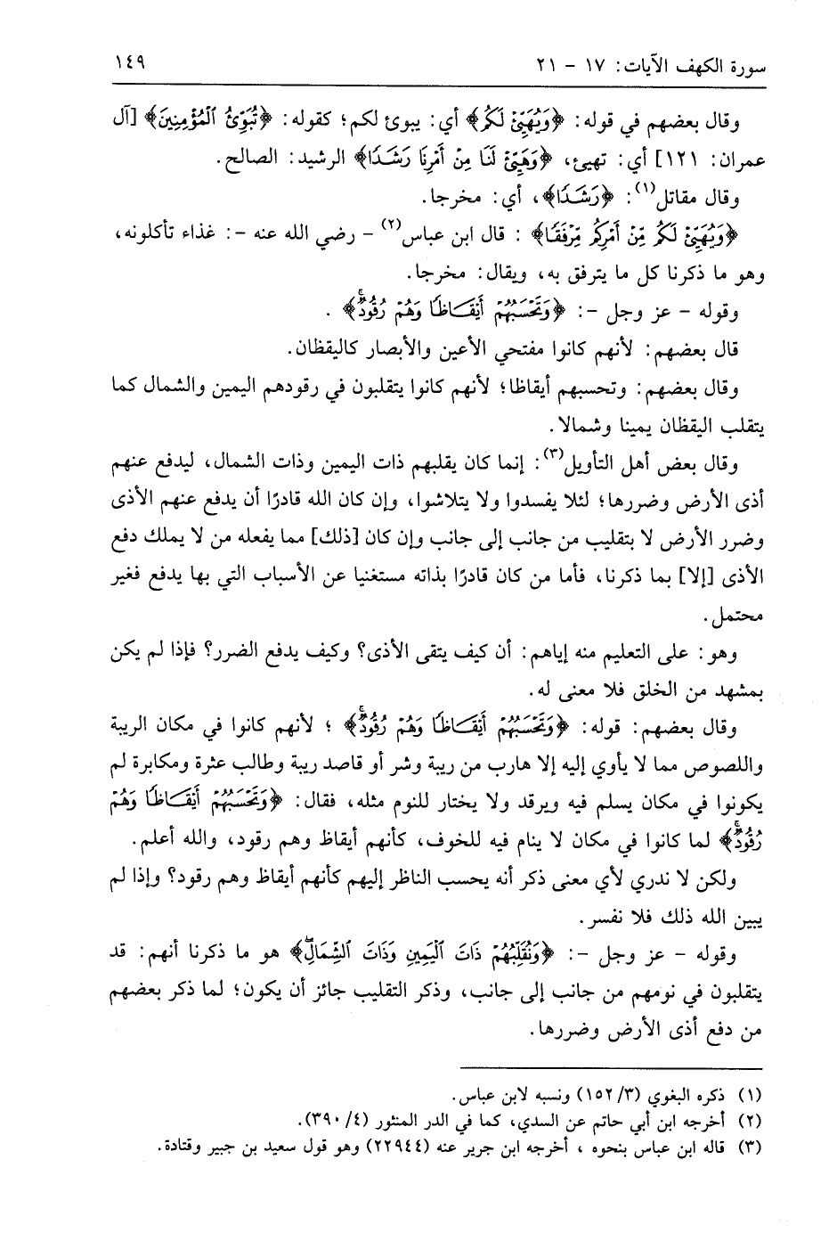 وقَالَ بَعْضُهُمْ: قوله: (وَتَحْسَبُهُمْ أَيْقَاظًا وَهُمْ رُقُودٌ)؛ لأنهم كانوا في مكان الريبة واللصوص مما لا يأوي إليه إلا هارب من ريبة وشر أو قاصد ريبة وطالب عثرة ومكابرة لم يكونوا في مكان يسلم فيه ويرقد ولا يختار للنوم مثله، فقال: (وَتَحْسَبُهُمْ أَيْقَاظًا وَهُمْ رُقُودٌ) ولما كانوا في مكان لا ينام فيه للخوف، كأنهم أيقاظ وهم رقود، واللَّه أعلم.