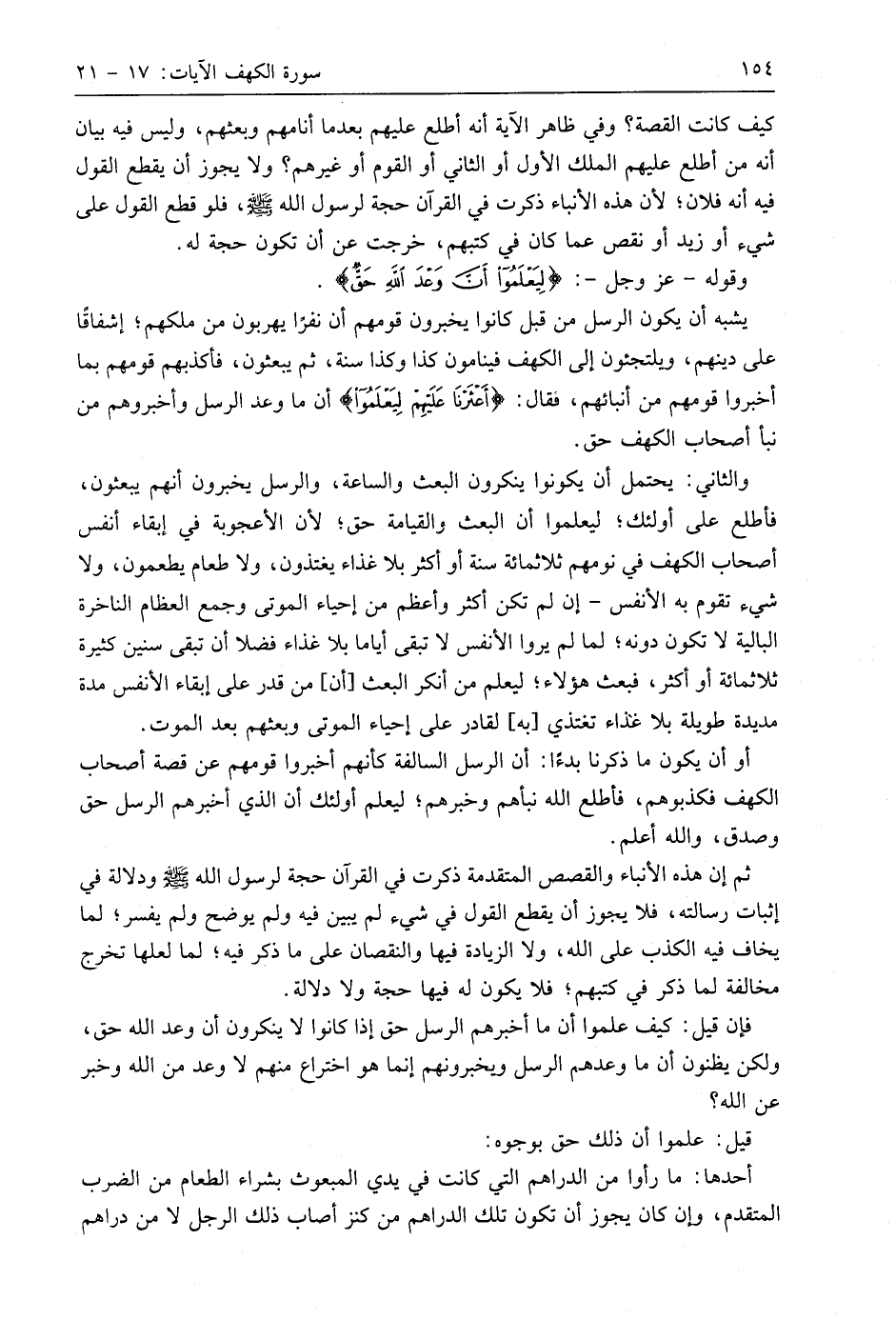 ثم إن هذه الأنباء والقصص المتقدمة ذكرت في القرآن حجة لرسول اللَّه - صَلَّى اللَّهُ عَلَيهِ وَسَلَّمَ - ودلالة في إثبات رسالته، فلا يجوز أن يقطع القول في شيء لم يبين فيه ولم يوضح ولم يفسر؛ لما يخاف فيه الكذب على اللَّه، ولا الزيادة فيها والنقصان على ما ذكر فيه؛ لما لعلها تخرج مخالفة لما ذكر في كتبهم؛ فلا يكون له فيها حجة ولا دلالة.