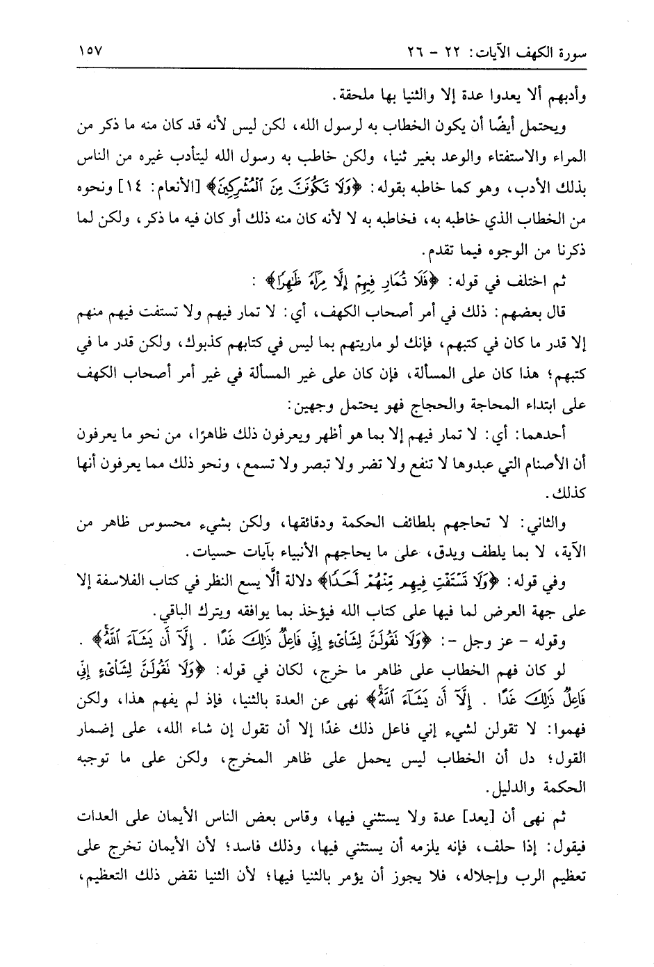 ويحتمل أيضًا أن يكون الخطاب به لرسول اللَّه، لكن ليس لأنه قد كان منه ما ذكر من المراء والاستفتاء والوعد بغير ثنيا، ولكن خاطب به رسول اللَّه ليتأدب غيره من الناس بذلك الأدب، وهو كما خاطبه بقوله: (وَلَا تَكُونَنَّ مِنَ الْمُشْرِكِينَ)، ونحوه من الخطاب الذي خاطبه به، فخاطبه به لا لأنه كان منه ذلك أو كان فيه ما ذكر، ولكن لما ذكرنا من الوجوه فيما تقدم.