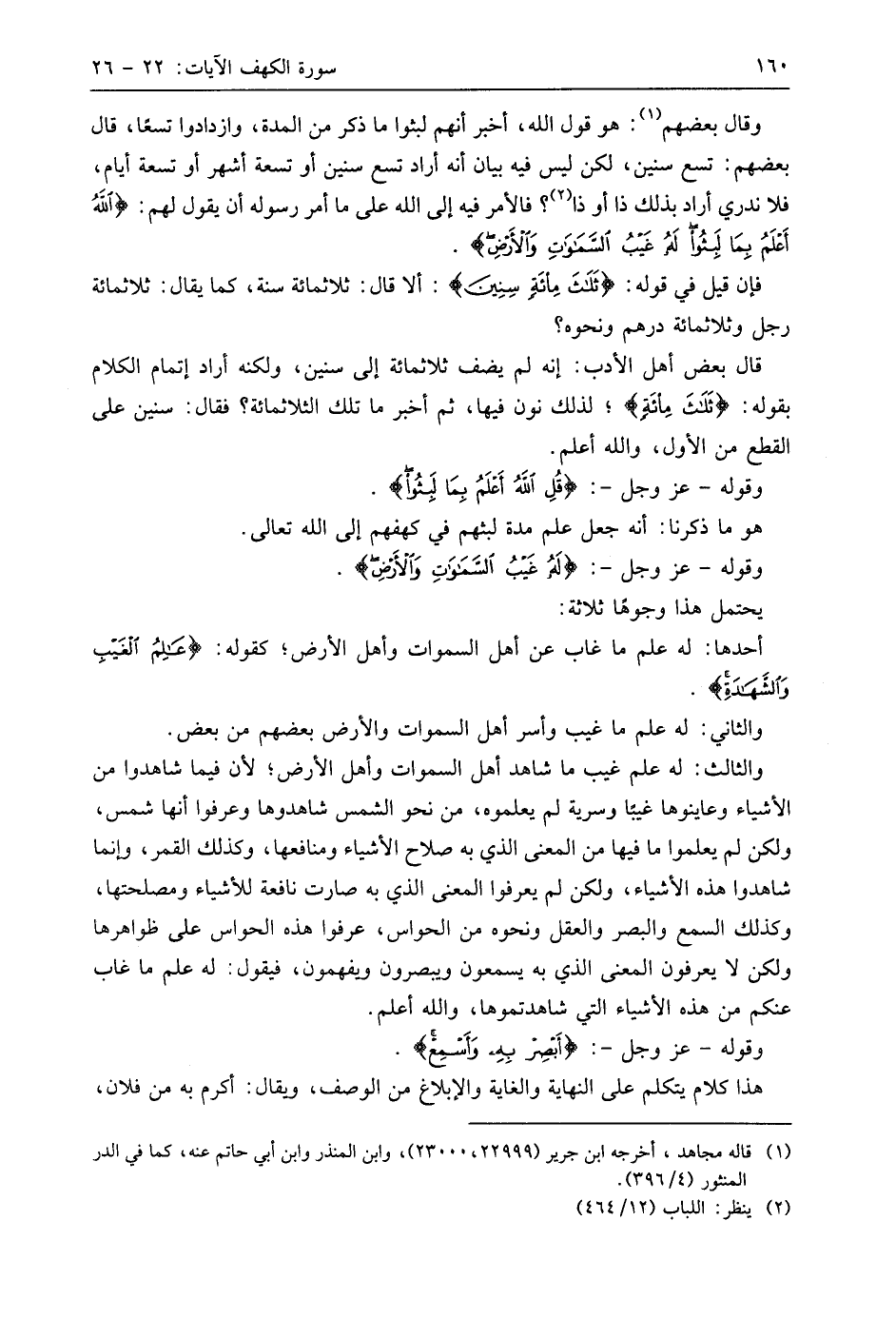 وقوله - عَزَّ وَجَلَّ -: (قُلِ اللَّهُ أَعْلَمُ بِمَا لَبِثُوا لَهُ غَيْبُ السَّمَاوَاتِ وَالْأَرْضِ أَبْصِرْ بِهِ وَأَسْمِعْ مَا لَهُمْ مِنْ دُونِهِ مِنْ وَلِيٍّ وَلَا يُشْرِكُ فِي حُكْمِهِ أَحَدًا (26)