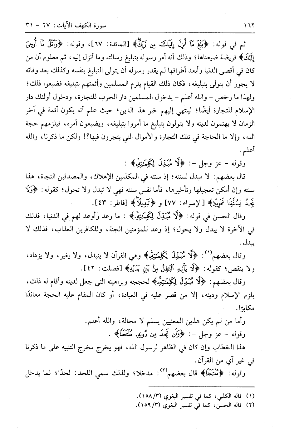 وقوله - عَزَّ وَجَلَّ -: (لَا مُبَدِّلَ لِكَلِمَاتِهِ):