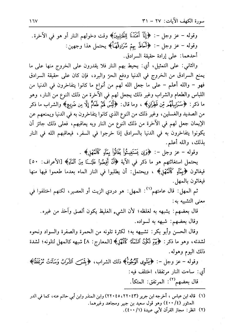 وقوله - عَزَّ وَجَلَّ -: (أَحَاطَ بِهِمْ سُرَادِقُهَا) يحتمل هذا وجهين: