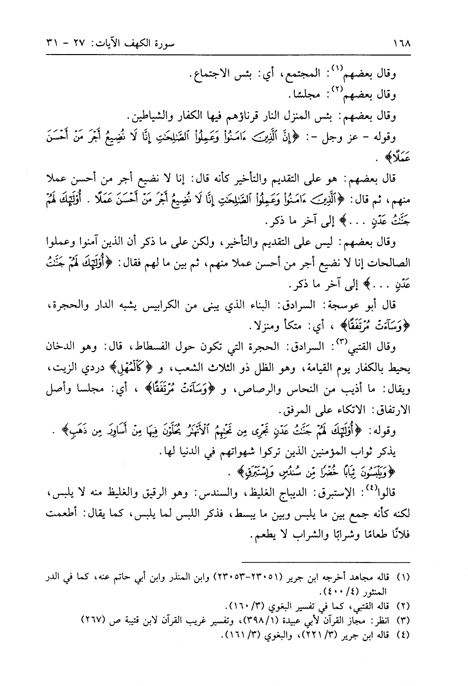 وقَالَ الْقُتَبِيُّ: السرادق: الحجرة التي تكون حول الفسطاط، قال: وهو الدخان يحيط بالكفار يوم القيامة، وهو الظل ذو الثلاث الشعب، و (كَالْمُهْلِ) دردي الزيت، ويقال: ما أذيب من النحاس والرصاص، (وَسَاءَتْ مُرْتَفَقًا)، أي: مجلسا وأصل الارتفاق: الاتكاء على المرفق.