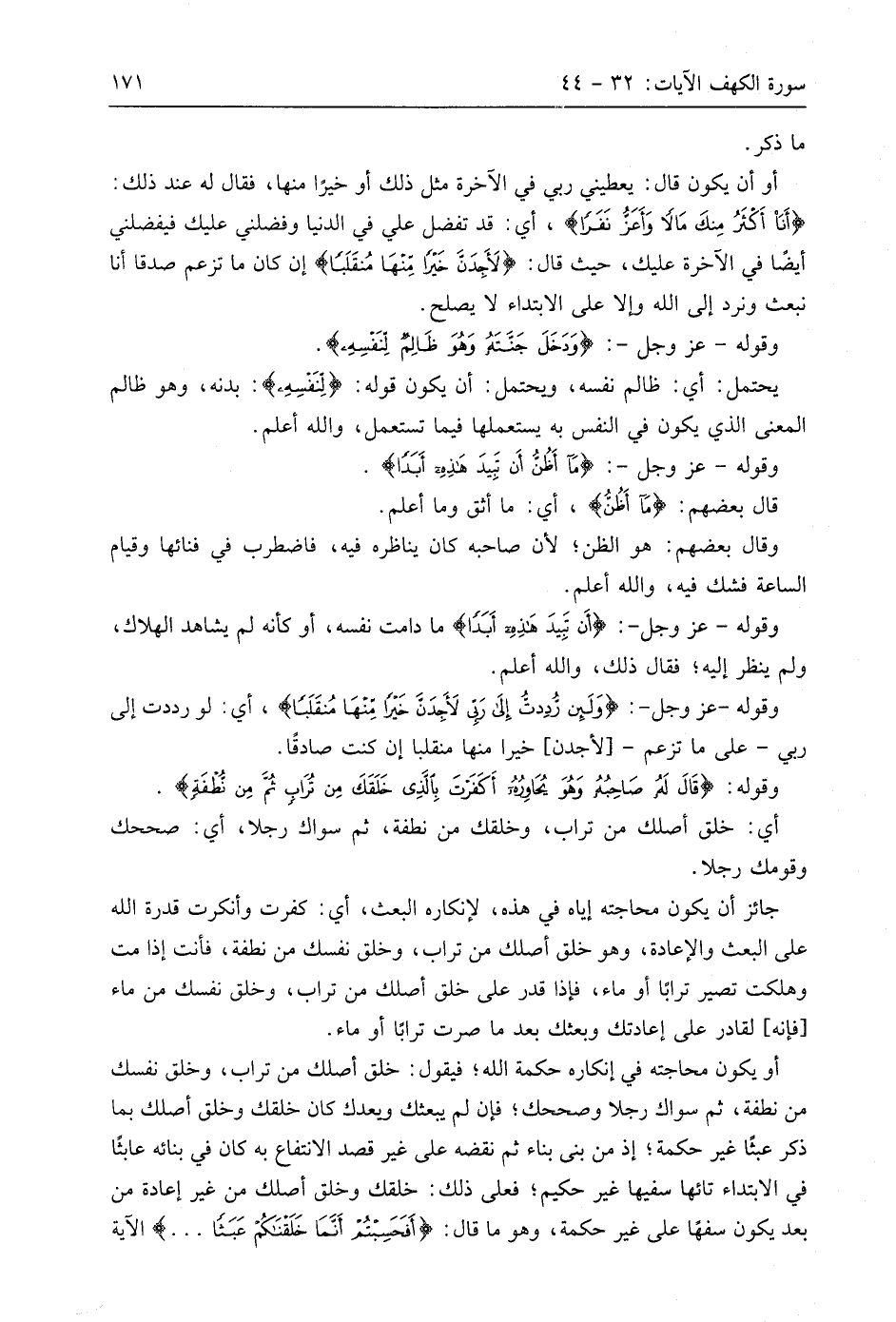 أو أن يكون قال: يعطيني ربي في الآخرة مثل ذلك أو خيرًا منها، فقال له عند ذلك: (أَنَا أَكْثَرُ مِنْكَ مَالًا وَأَعَزُّ نَفَرًا)، أي: قد تفضل علي في الدنيا وفضلني عليك فيفضلني أيضًا في الآخرة عليك، حيث قال: (لَأَجِدَنَّ خَيْرًا مِنْهَا مُنْقَلَبًا) إن كان ما تزعم صدقا أنا نبعث ونرد إلى اللَّه وإلا على الابتداء لا يصلح.