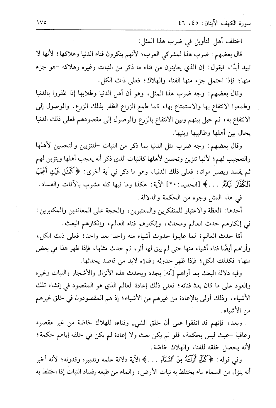 قَالَ بَعْضُهُمْ: ضرب هذا لمشركي العرب؛ لأنهم ينكرون فناء الدنيا وهلاكها؛ لأنها لا تبيد أبدًا، فيقول: إن الذي يعاينون من فناء ما ذكر من النبات وغيره وهلاكه - هو جزء منها؛ فإذا احتمل جزء منها الفناء والهلاك؛ فعلى ذلك الكل.